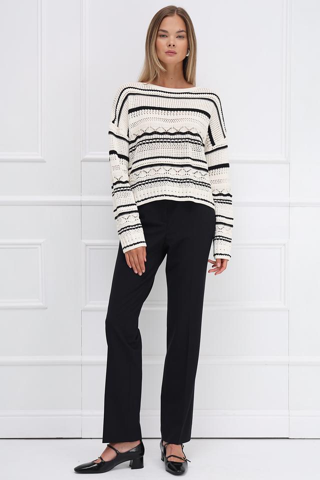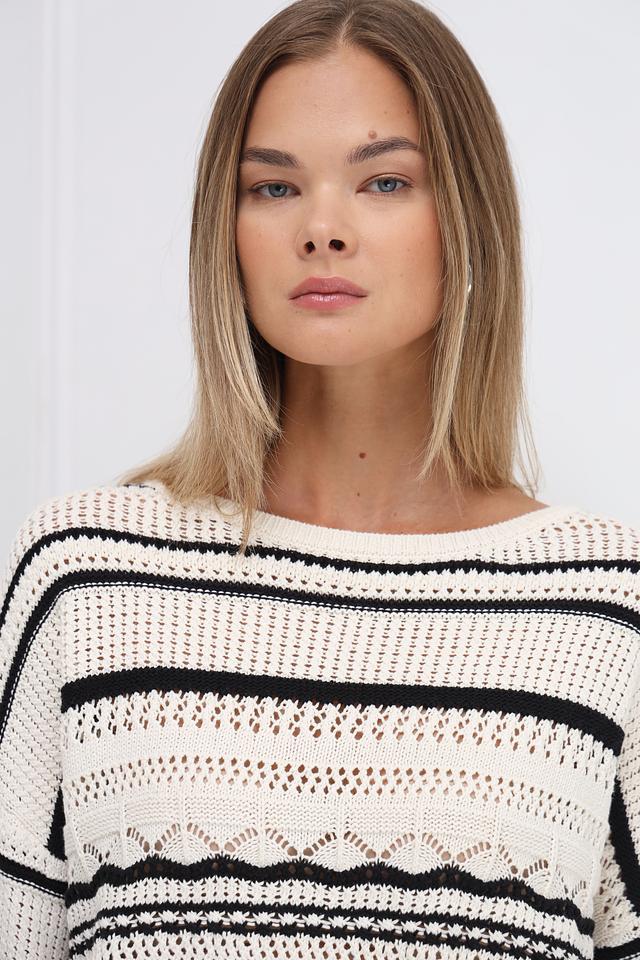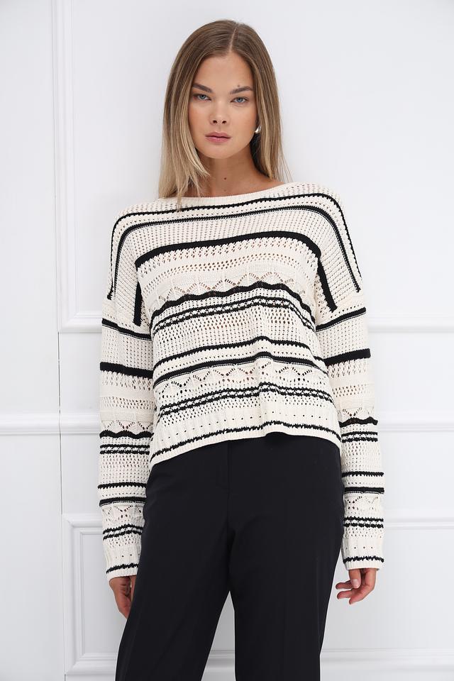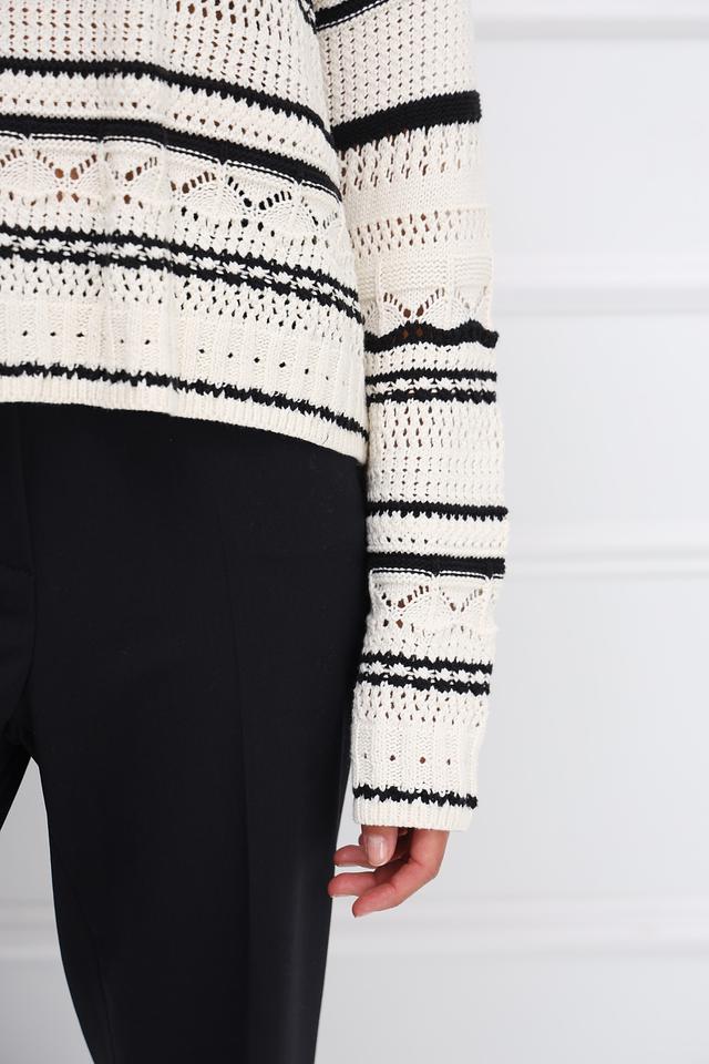 Дизайн пуловера включает в себя сочетание различных полосатых узоров, включая широкие и узкие полосы, а также элементы с ажурной вязкой. Вырез горловины округлый, а длинные рукава заканчиваются манжетами с аналогичным полосатым узором.