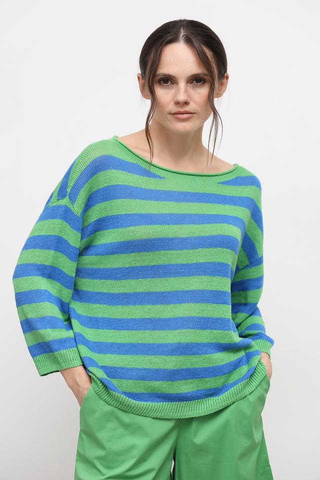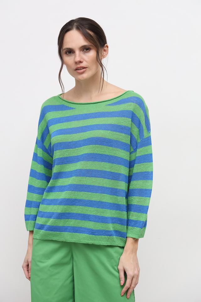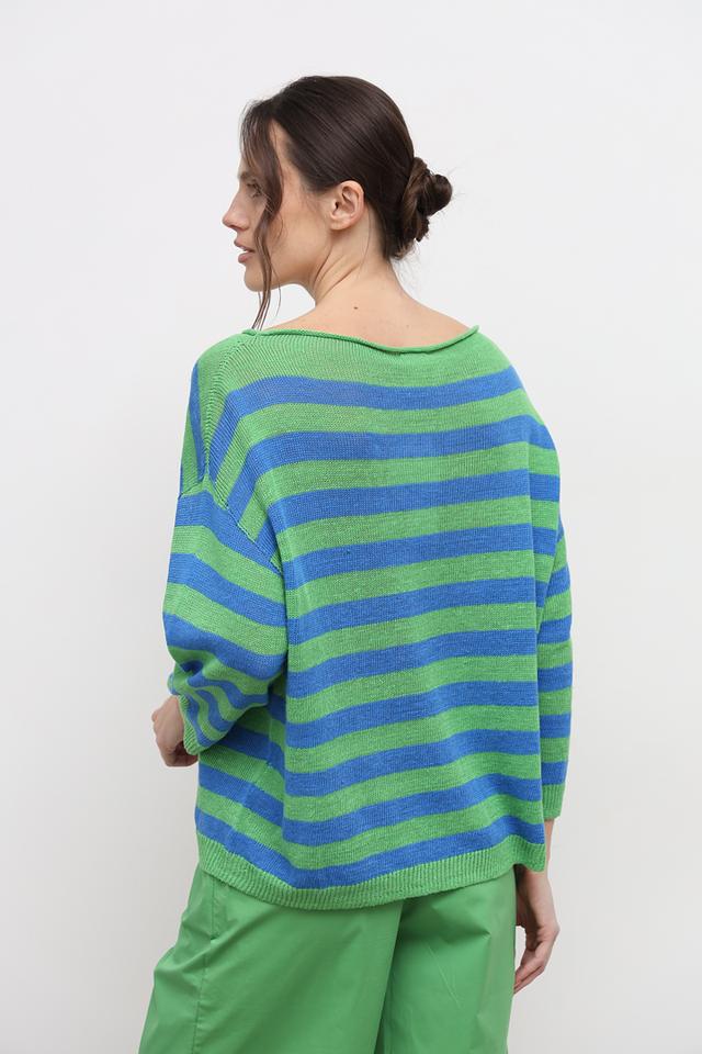 Пуловер имеет классический крой с округлым вырезом горловины и рукавами три четверти. Широкая полоска в сочетании зеленого и голубого цветов придает изделию свежий и современный вид.
