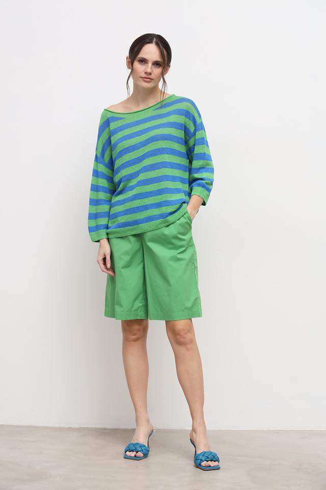 Женский пуловер Oui зеленого и голубого цвета выполнен в широкую полоску. Модель с округлым вырезом и рукавами 3/4, изготовлена из 100% льна. Состав: лен 100%