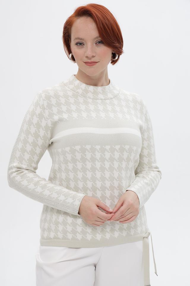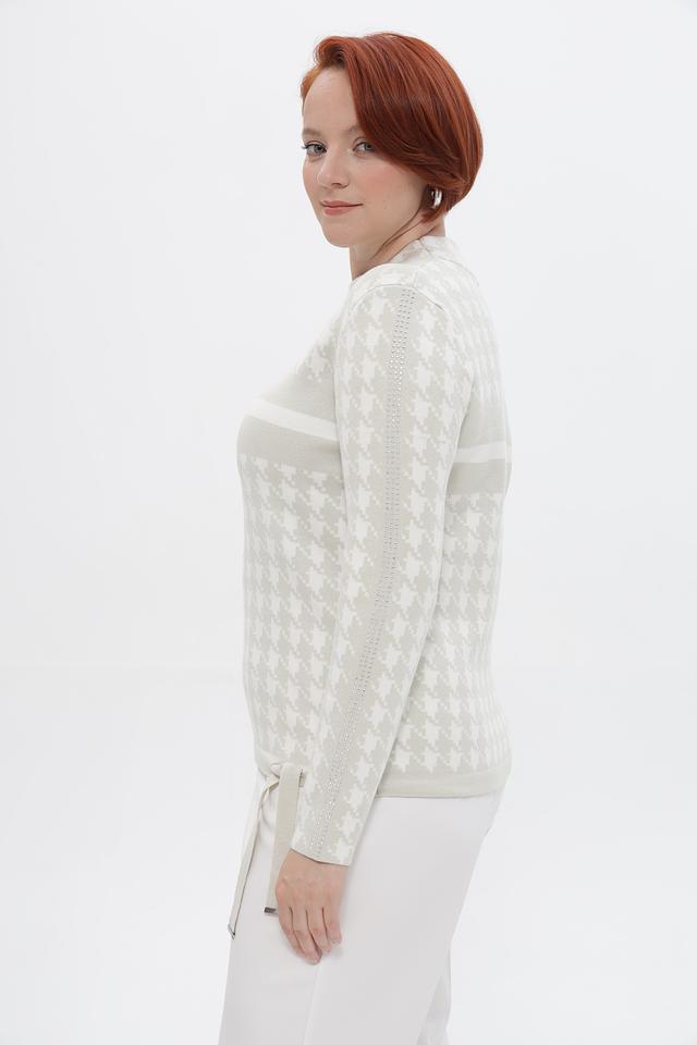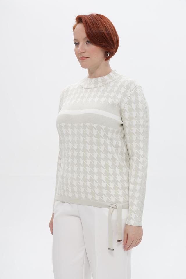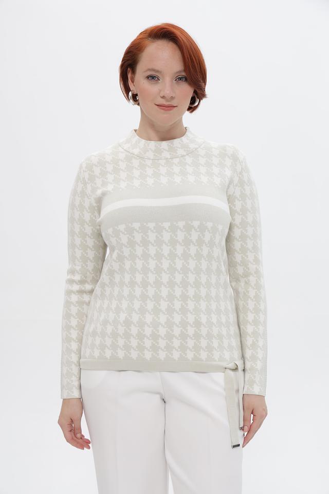 Этот стильный пуловер от Passioni выполнен в бежевых тонах с классическим принтом «гусиная лапка», придающим образу элегантность и изысканность.