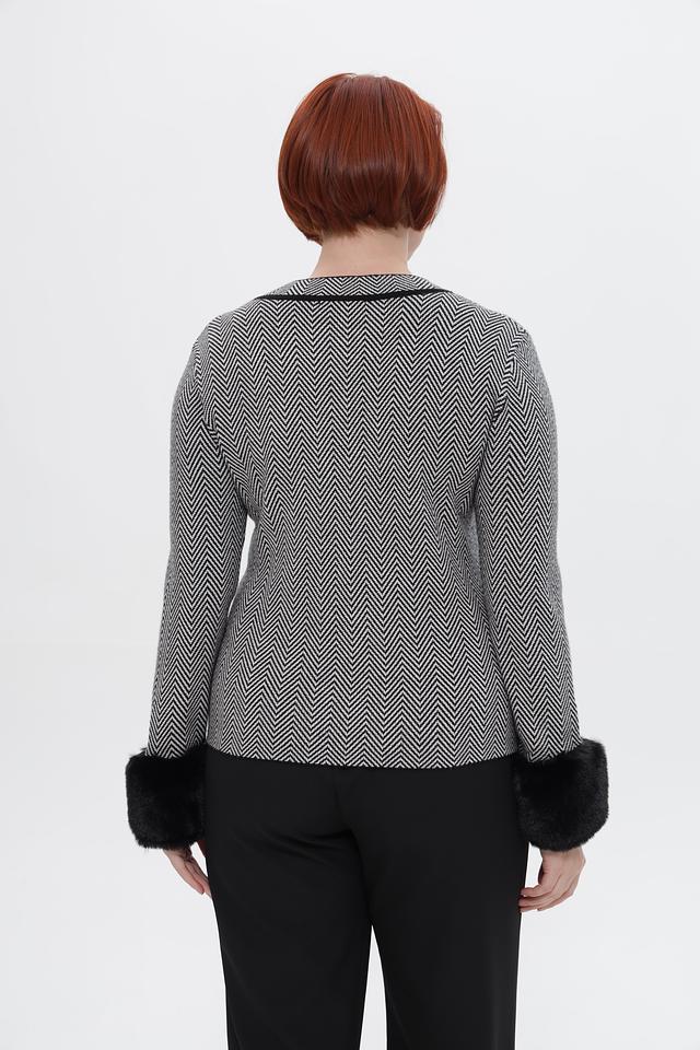Пуловер имеет классический крой с округлым вырезом горловины и длинными рукавами. Особый акцент в этой модели — манжеты из мягкого искусственного меха чёрного цвета, которые придают образу роскошь и элегантность.