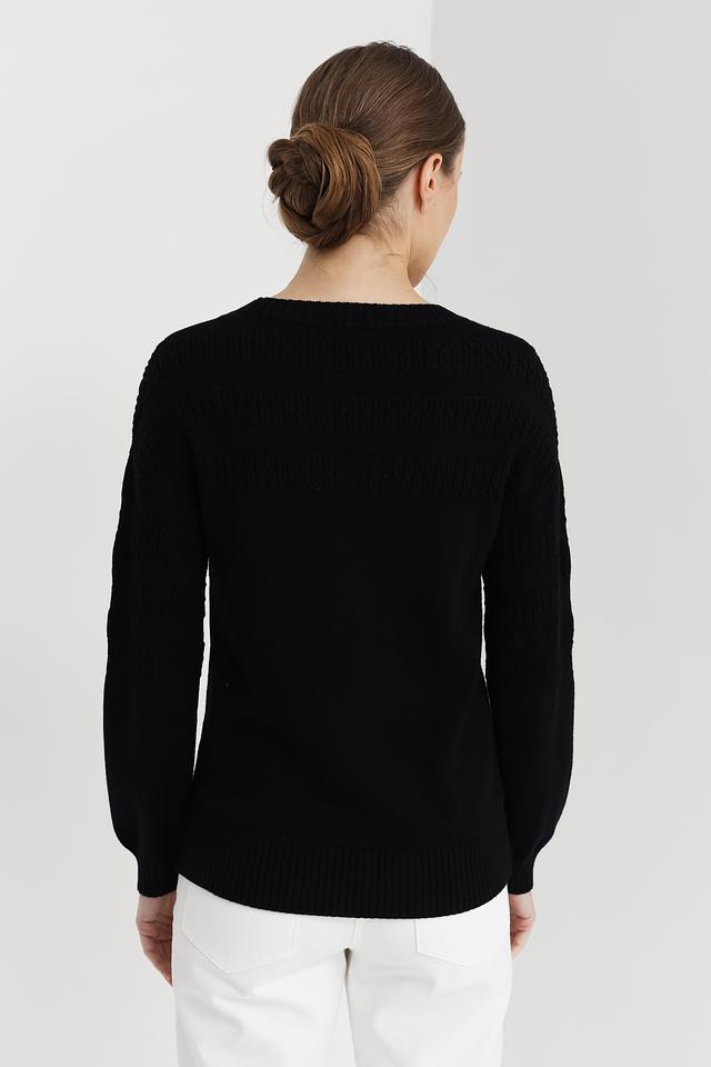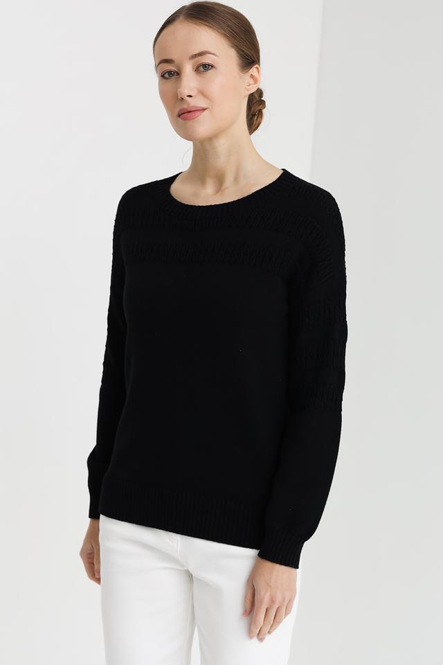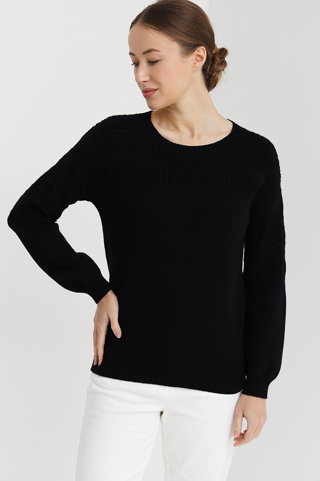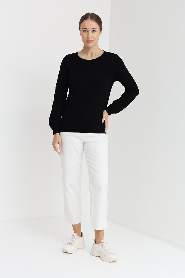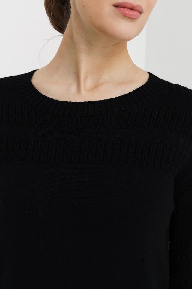 Модель имеет классический крой с круглым вырезом горловины и длинными рукавами. Особый акцент сделан на декоративный узор, расположенный на плечах и верхней части груди, который добавляет изделию изысканности. Пуловер имеет стандартную длину и хорошо сочетается с джинсами, брюками или юбками.