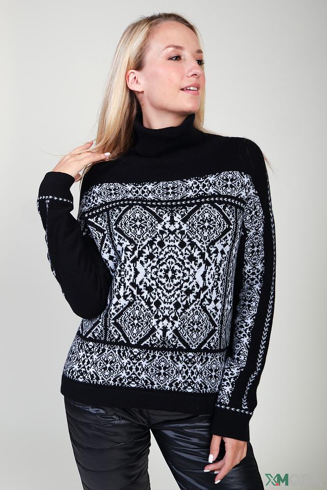 Чёрный пуловер Pezzo с высоким воротом и геометрическим узором. Изготовлен из мягкой смеси шерсти и хлопка, обеспечивающей комфорт и тепло. Идеальный выбор для создания стильного и уютного образа. Состав: шерсть 57%, хлопок 43%