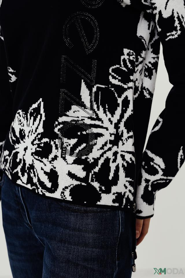 Этот стильный пуловер от Pezzo выполнен в чёрном цвете и украшен крупным цветочным принтом белого цвета. Модель имеет круглый вырез горловины и длинные рукава, что делает его универсальным для различных образов.