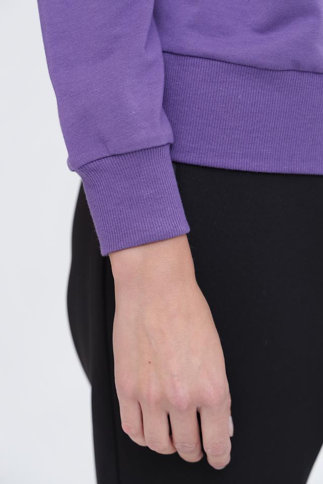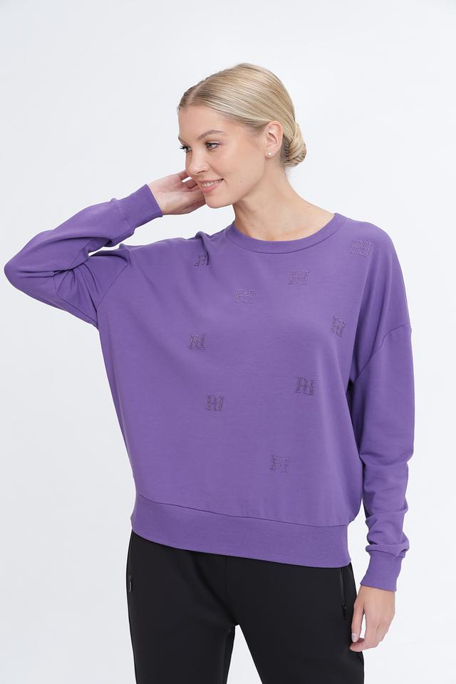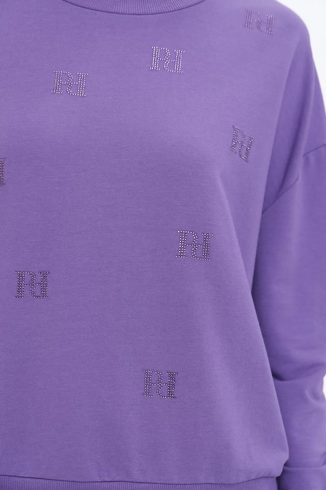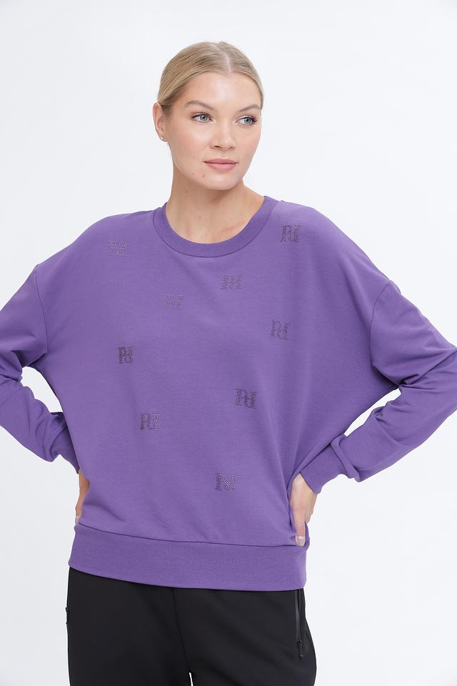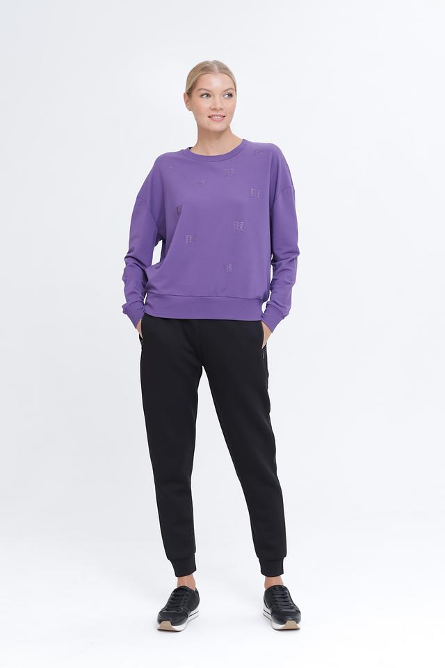 Пуловер имеет свободный крой, круглый вырез горловины и длинные рукава. Его отличает стильный дизайн с повторяющимся логотипом бренда, выполненным в тон изделия. Фиолетовый цвет пуловера придаёт ему особую изысканность и позволяет легко сочетать его с другими элементами одежды.