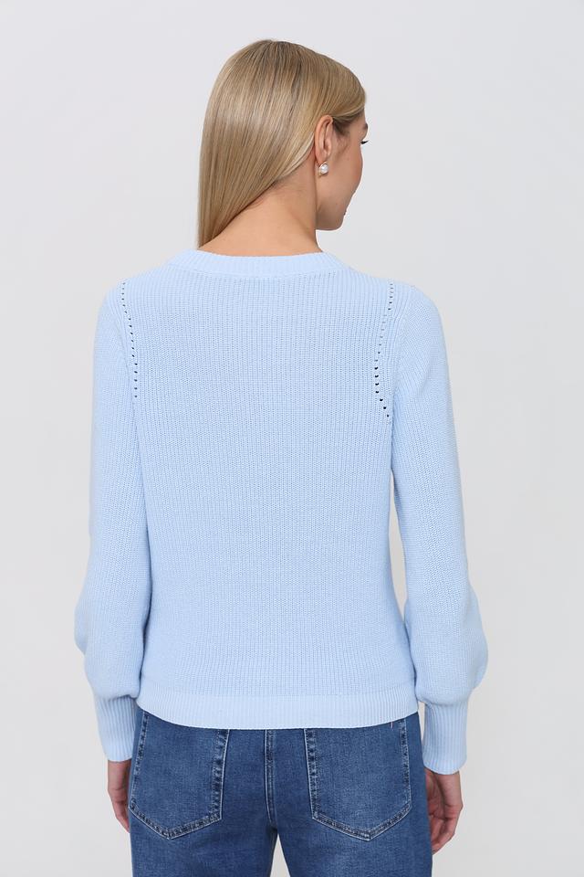 Пуловер имеет нежный голубой цвет и классический крой с круглым вырезом горловины. Особый шарм изделию придаёт ажурный узор, расположенный на плечах и рукавах, который добавляет ему изысканности и оригинальности.