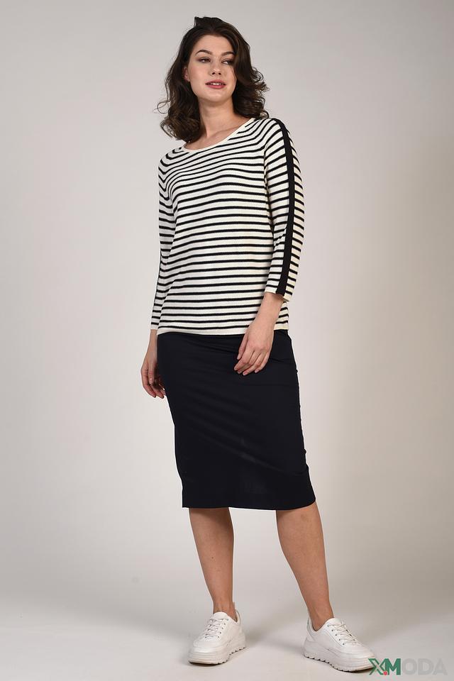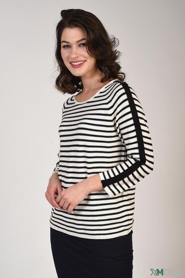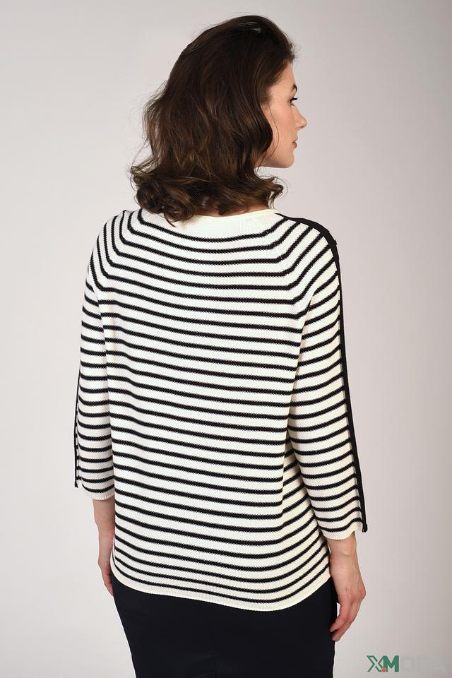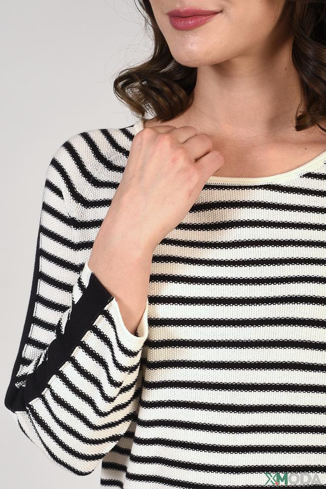 Женский пуловер Pezzo чёрно-белого цвета с полоской и декоративной черной полосой на рукаве. Модель выполнена из мягкого и приятного к телу сочетания хлопка и акрила. Состав: хлопок 50%, акрил 50%