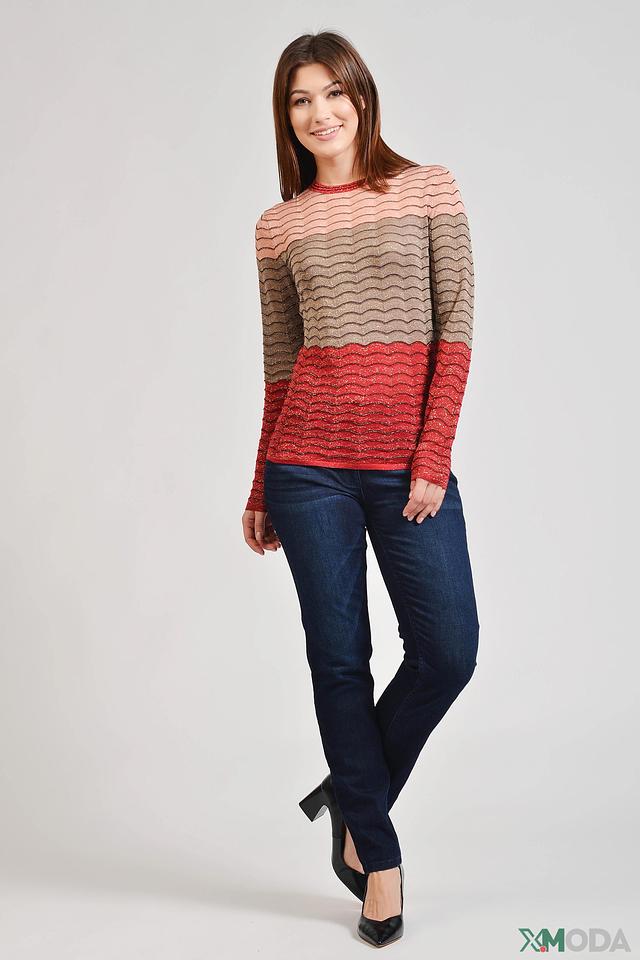 Женский пуловер Pezzo в красно-бежевой гамме с оригинальным волнистым узором. Модель выполнена из мягкой вискозы с добавлением полиэстера и металла, что придает ей деликатный блеск и комфорт в носке. Состав: вискоза 71%, полиэстер 21%, металл 8%