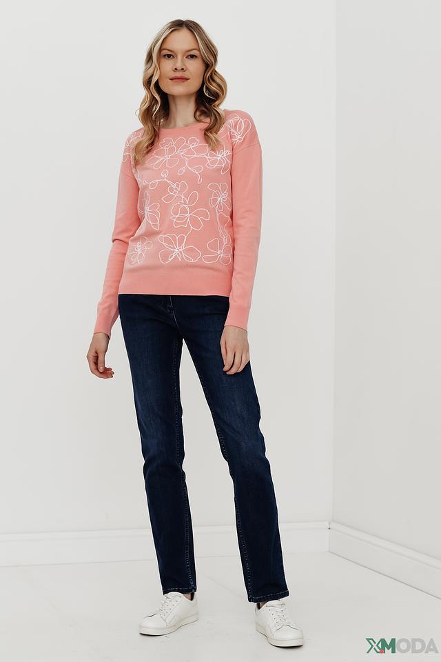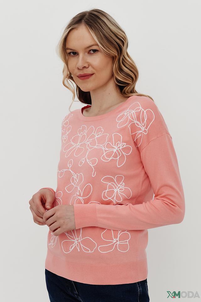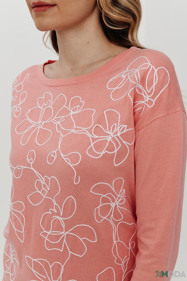 Пуловер имеет нежно-розовый цвет и украшен вышивкой в виде стилизованных цветов белого цвета. Круглый вырез горловины и прямой крой делают его универсальным и подходящим для различных типов фигур.
