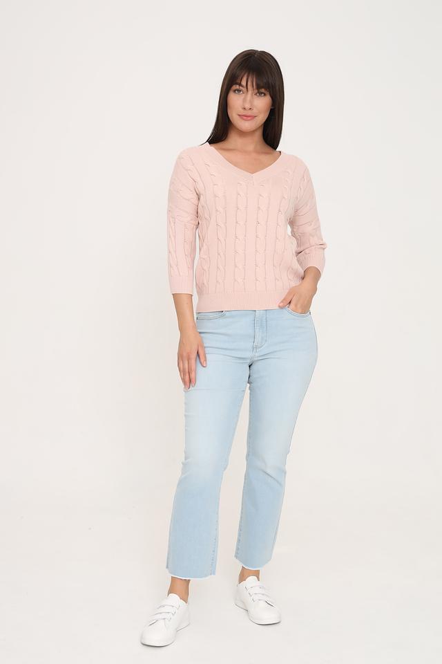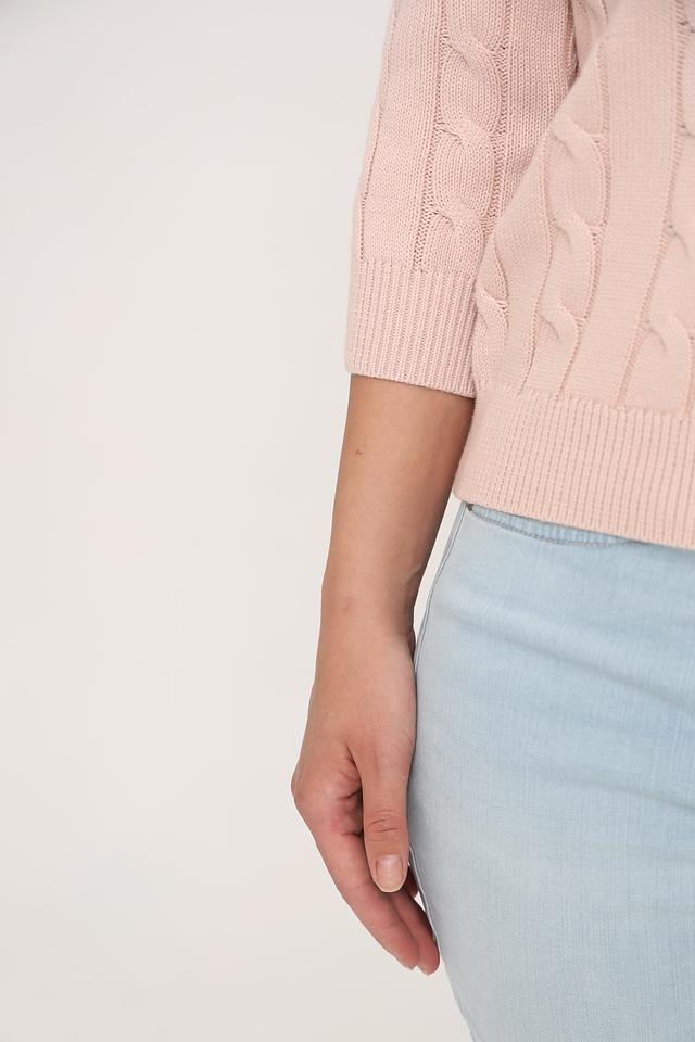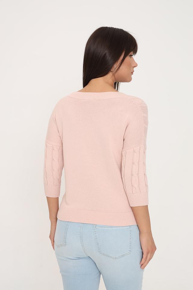 Основной акцент в дизайне пуловера – это рельефный узор "косы", который придает изделию текстуру и объем. Рукава укороченные, три четверти, что делает этот пуловер идеальным для теплой погоды или для создания многослойных образов.