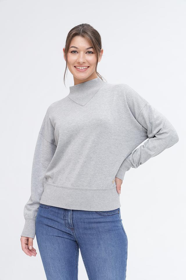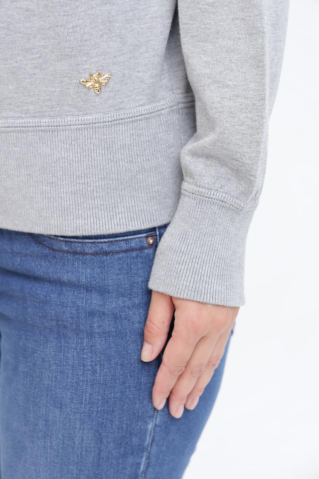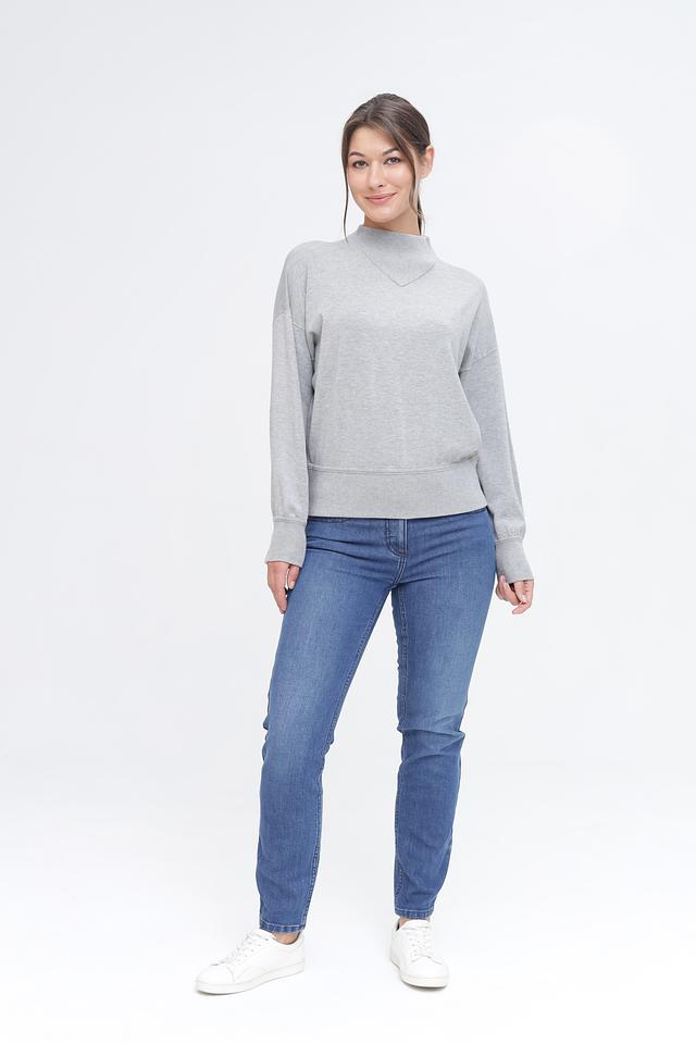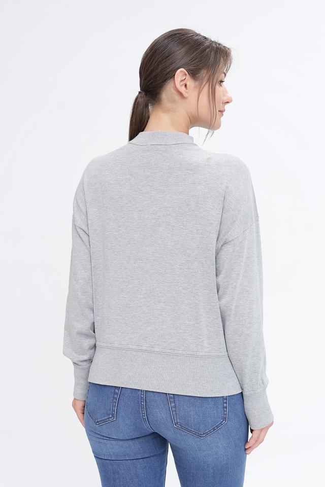 Пуловер имеет свободный крой, который не сковывает движения и обеспечивает комфорт в течение всего дня. Рукава слегка спущены, что придает образу расслабленность. На рукаве расположен небольшой декоративный элемент в золотистом цвете.