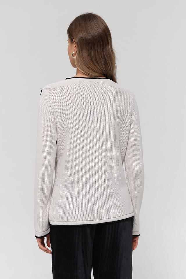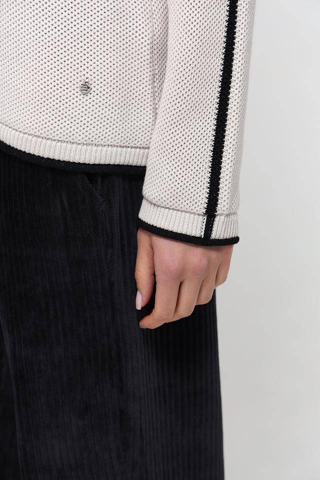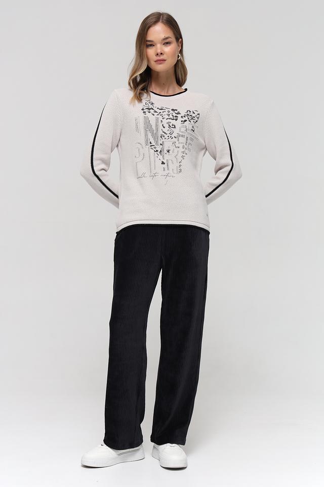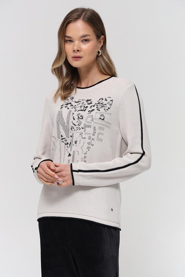 Бежевый пуловер от Rabe collection с оригинальным принтом и чёрной отделкой. Модель выполнена из мягкого трикотажа с добавлением акрила, что обеспечивает комфорт и удобство в носке. Состав: хлопок 50%, полиакрил 50%