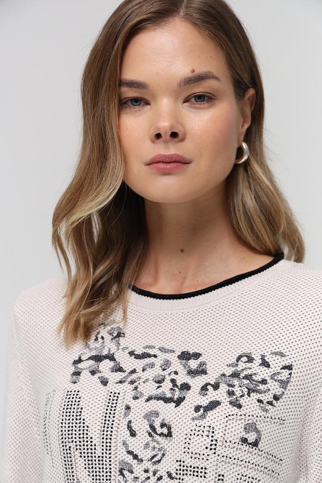 Этот стильный пуловер от Rabe collection станет прекрасным дополнением к вашему гардеробу. Пуловер выполнен в нежном бежевом цвете и украшен оригинальным принтом с изображением абстрактных элементов и надписей.