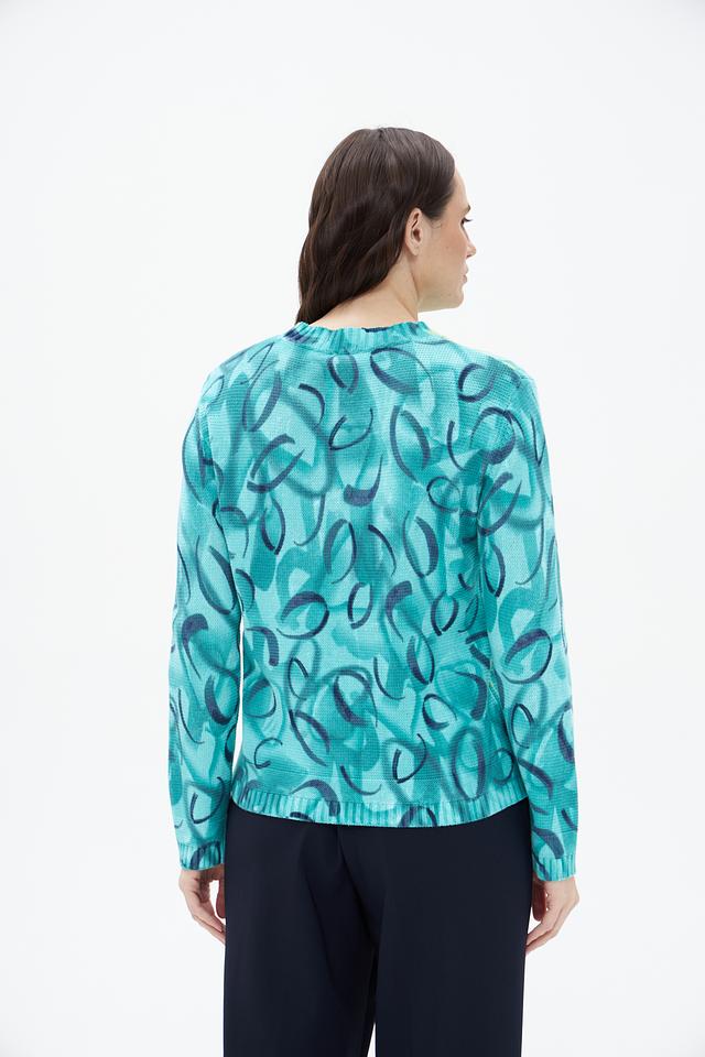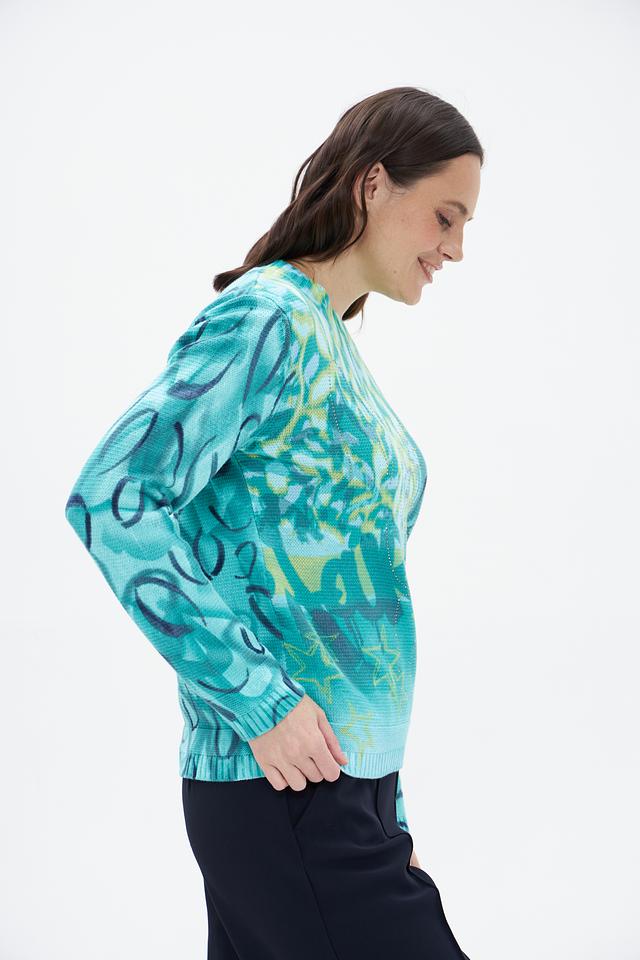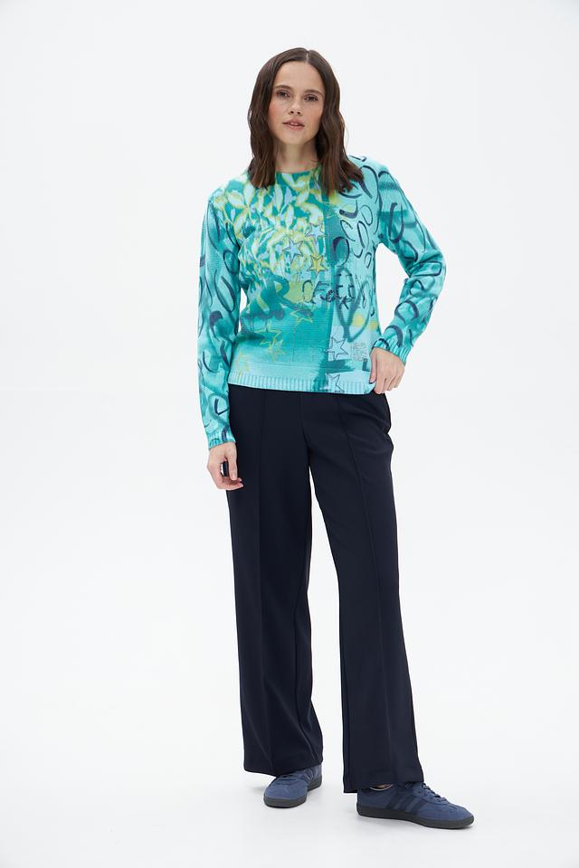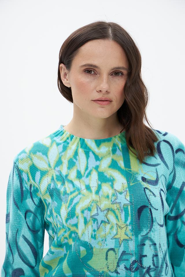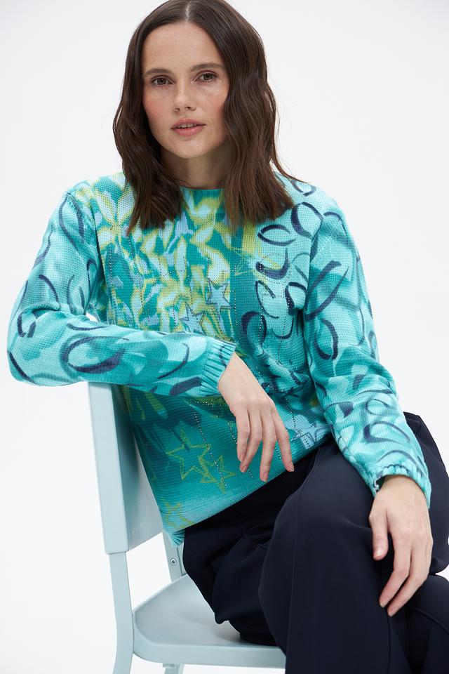 Пуловер имеет свободный крой и круглый вырез горловины. Главная особенность модели – эффектный принт, сочетающий в себе абстрактные узоры и изображения звёзд в бирюзовой и зелёной гамме.