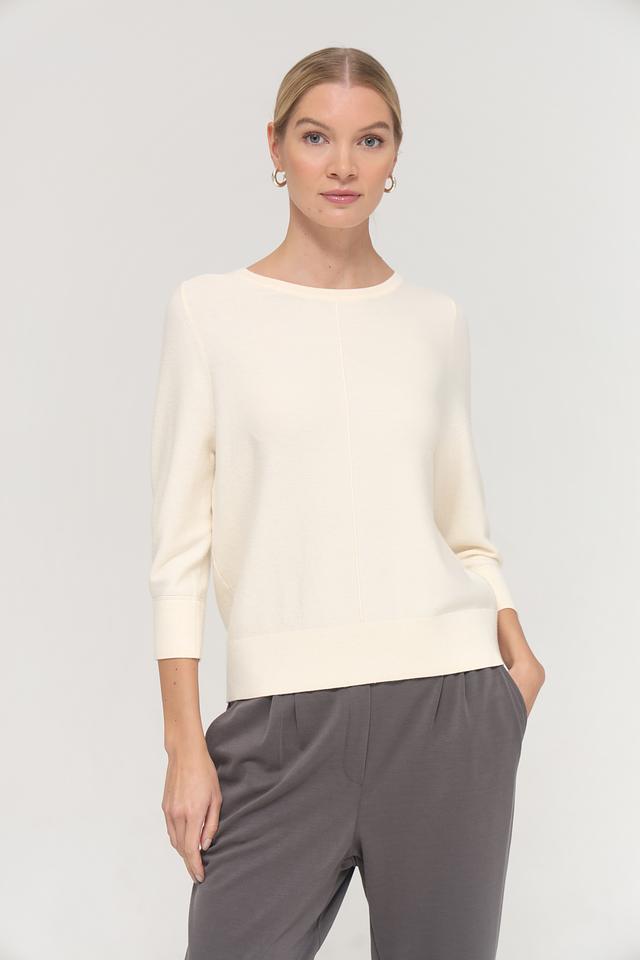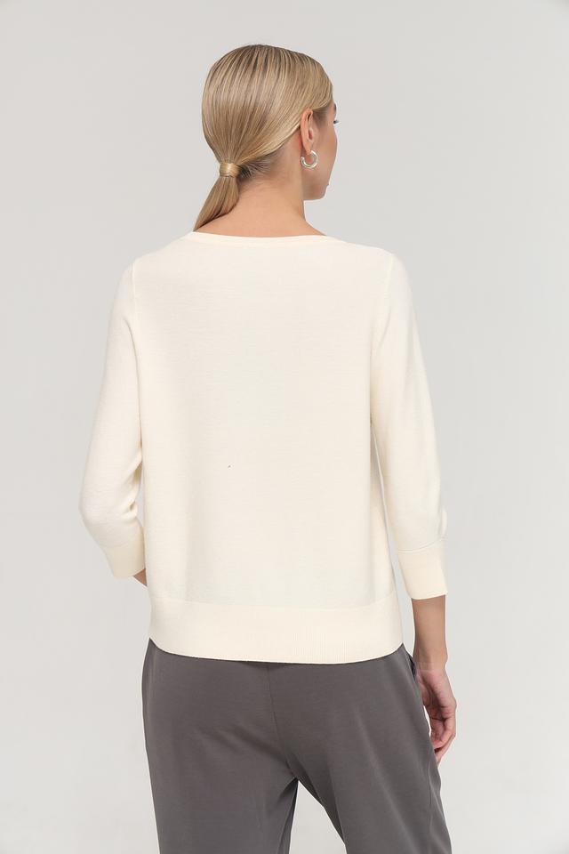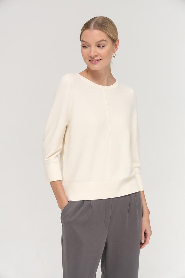 Пуловер имеет круглый вырез горловины и рукава длиной 3/4, что придает ему элегантный и женственный вид. Текстура трикотажа мягкая и приятная на ощупь, благодаря сочетанию вискозы, полиэстера и полиамида в составе.