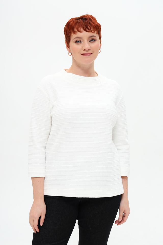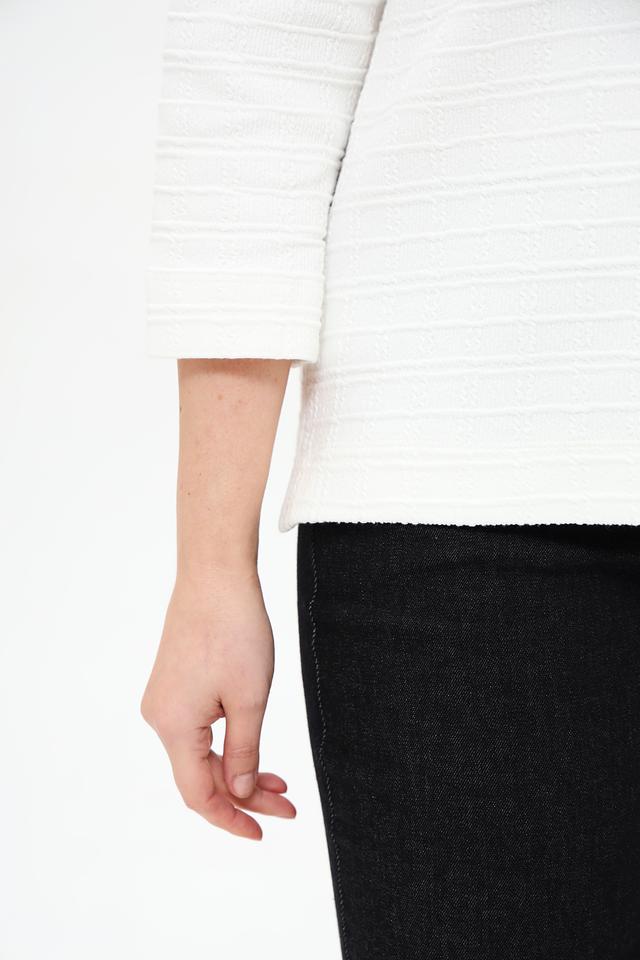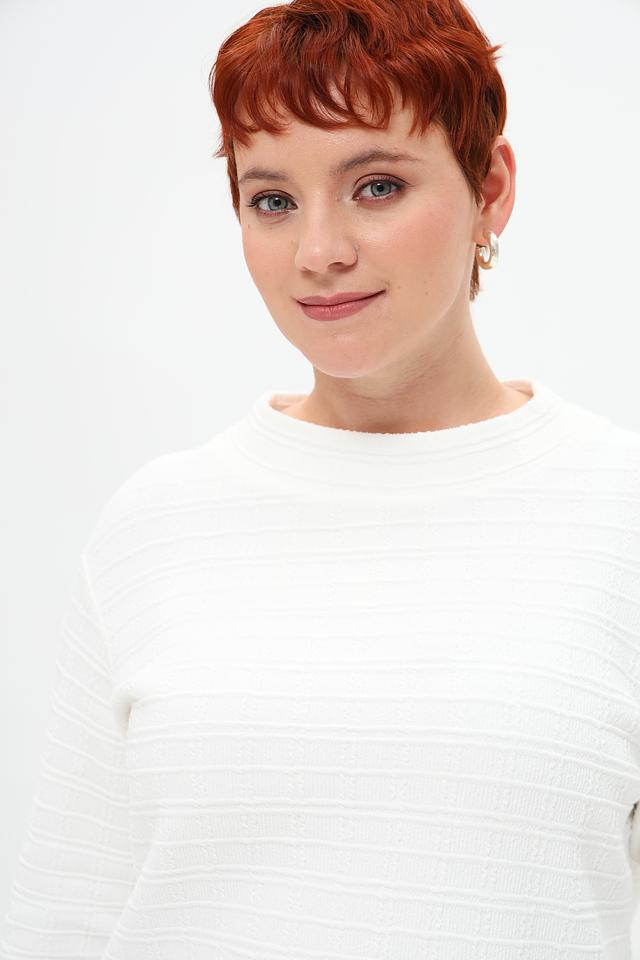 Текстурированная вязка придает пуловеру особый шарм и делает его более интересным. Состав ткани включает 85% хлопок, 12% полиэстер и 3% эластан, что обеспечивает комфорт, мягкость и хорошую посадку по фигуре.
