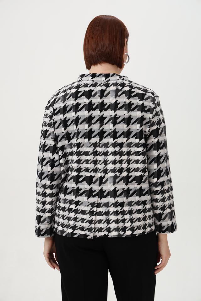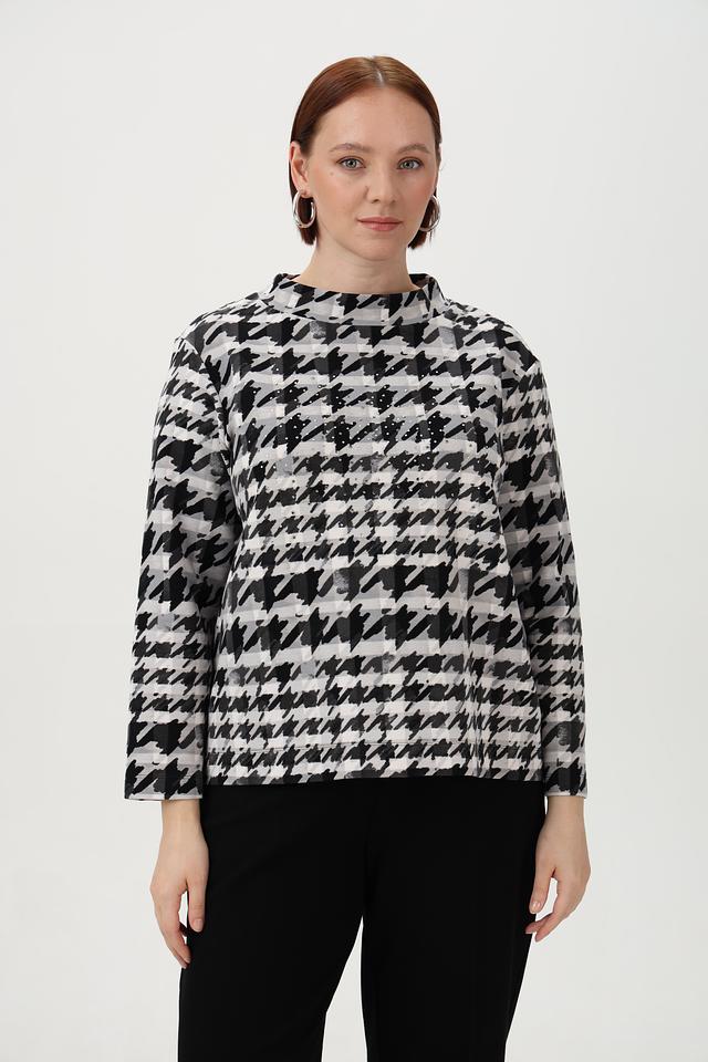 Стильный пуловер от Rabe collection серого цвета с актуальным принтом "гусиная лапка". Изготовлен из мягкого и приятного к телу трикотажа, содержащего хлопок, полиэстер и эластан. Состав: хлопок 76%, полиэстер 16%, эластан 8%