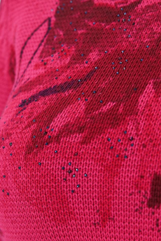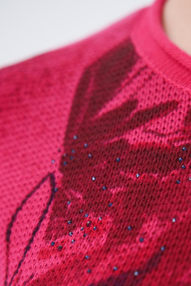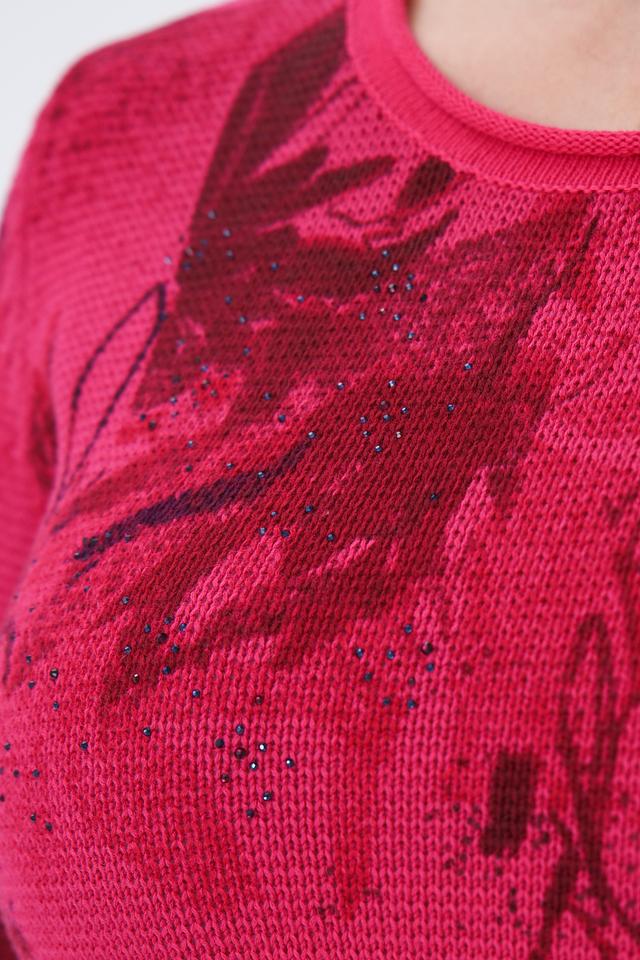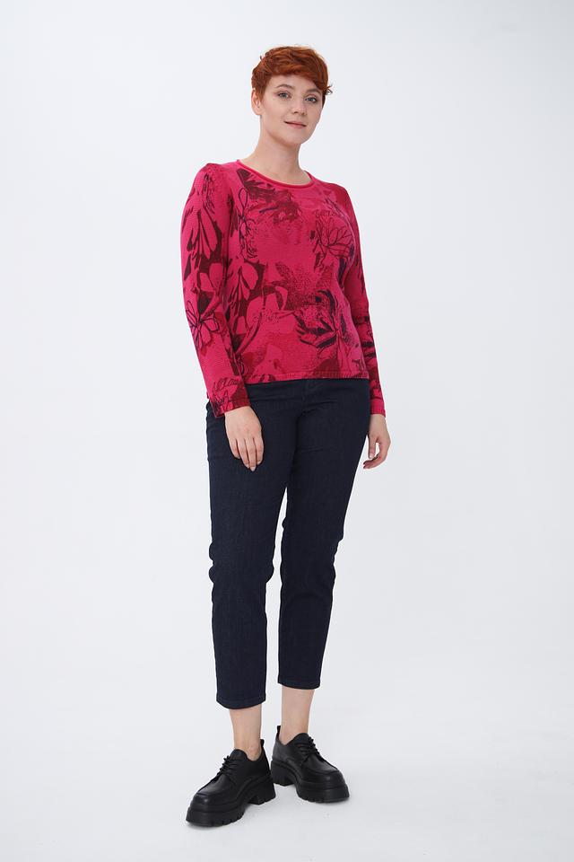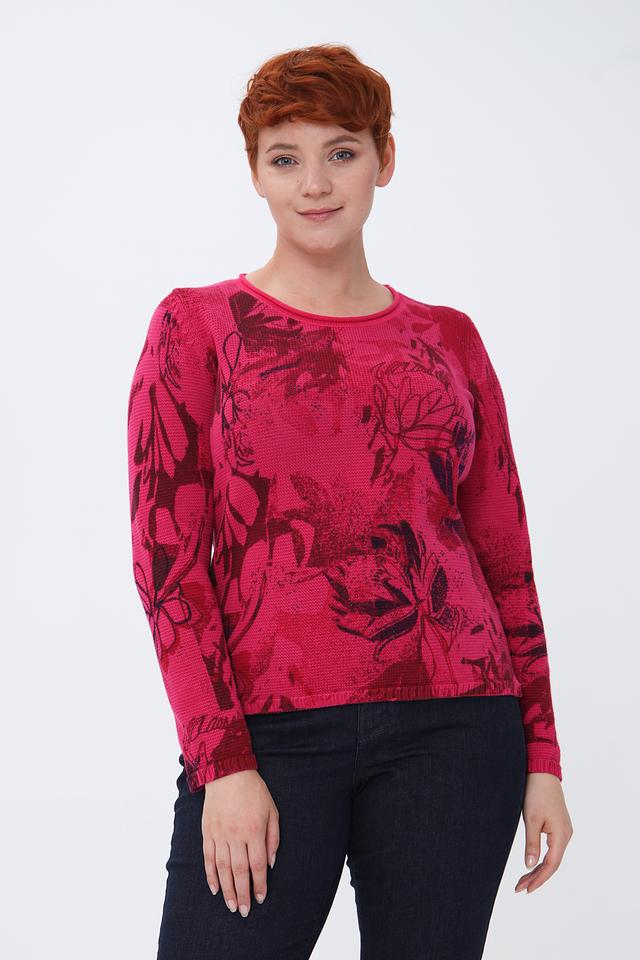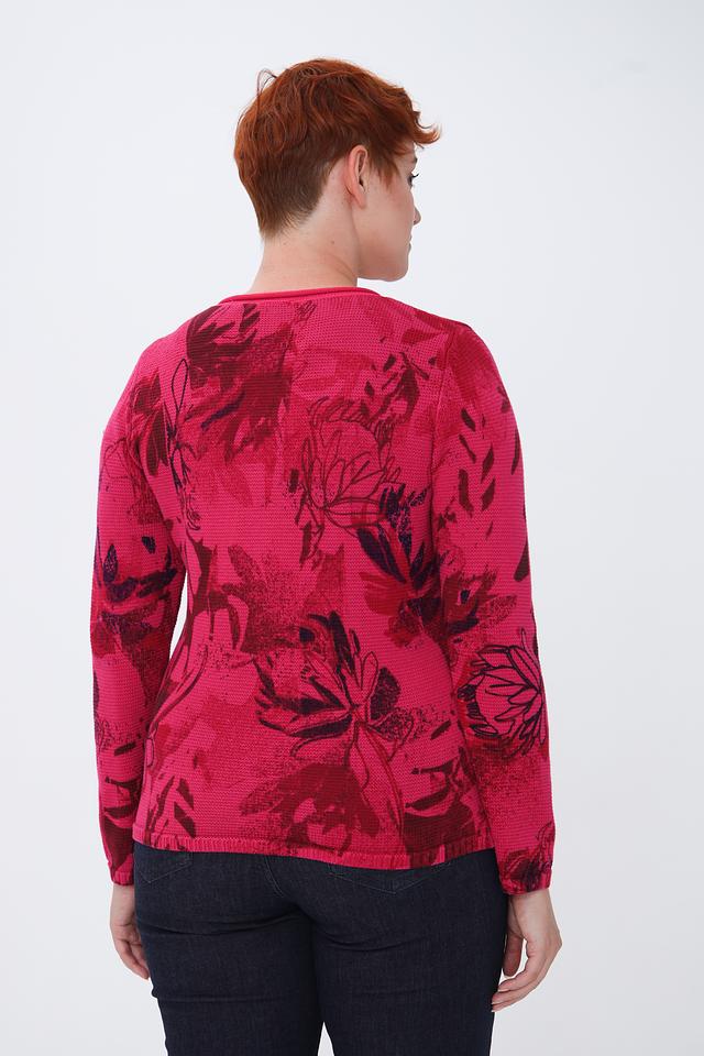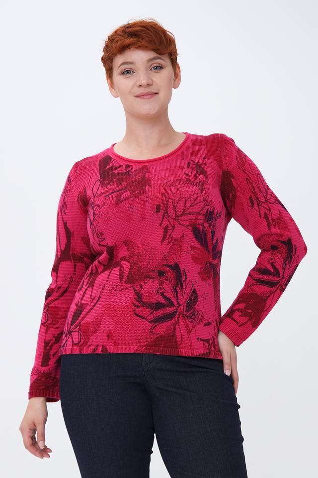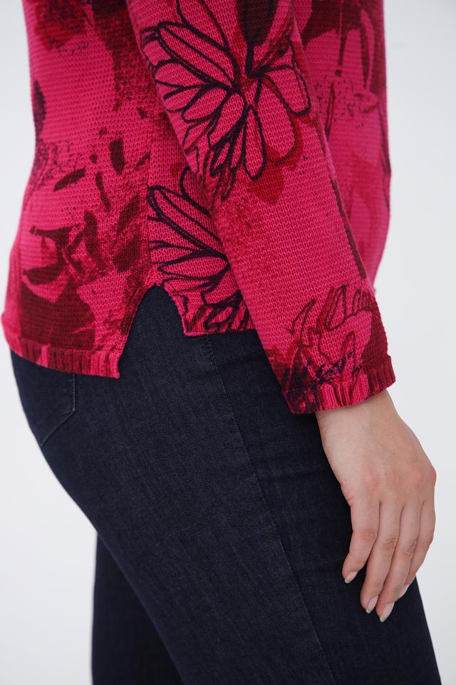 Пуловер имеет яркий фуксиевый цвет, украшенный эффектным цветочным принтом. Рисунок выполнен в различных оттенках красного и бордового, создавая интересный визуальный эффект.