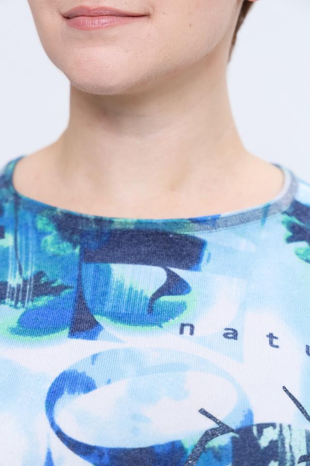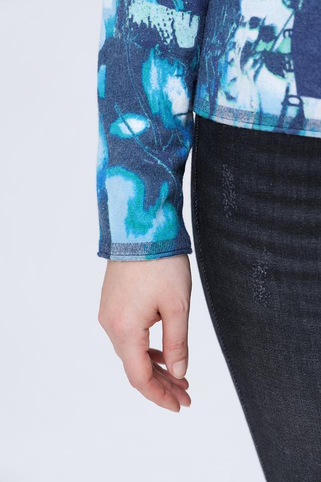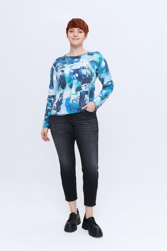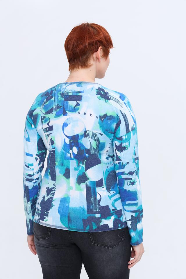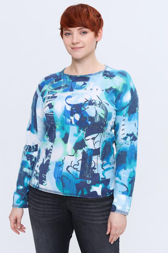 Пуловер имеет свободный крой, который не сковывает движений и позволяет создать расслабленный образ. Яркий абстрактный принт в бирюзовых тонах делает его акцентным элементом вашего наряда. Круглый вырез горловины и длинные рукава обеспечивают дополнительный комфорт.