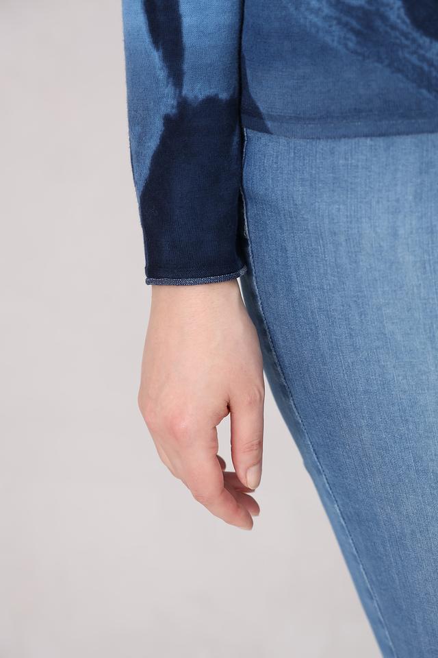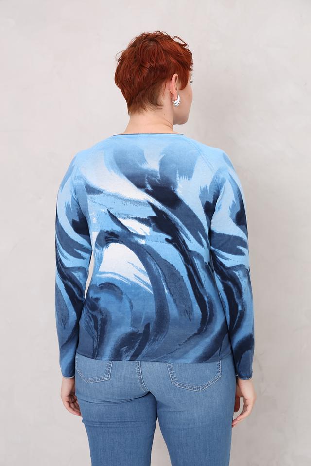 Пуловер имеет свободный крой и круглый вырез горловины. Главная особенность модели – яркий и необычный принт в голубых тонах, который придает ей индивидуальность.