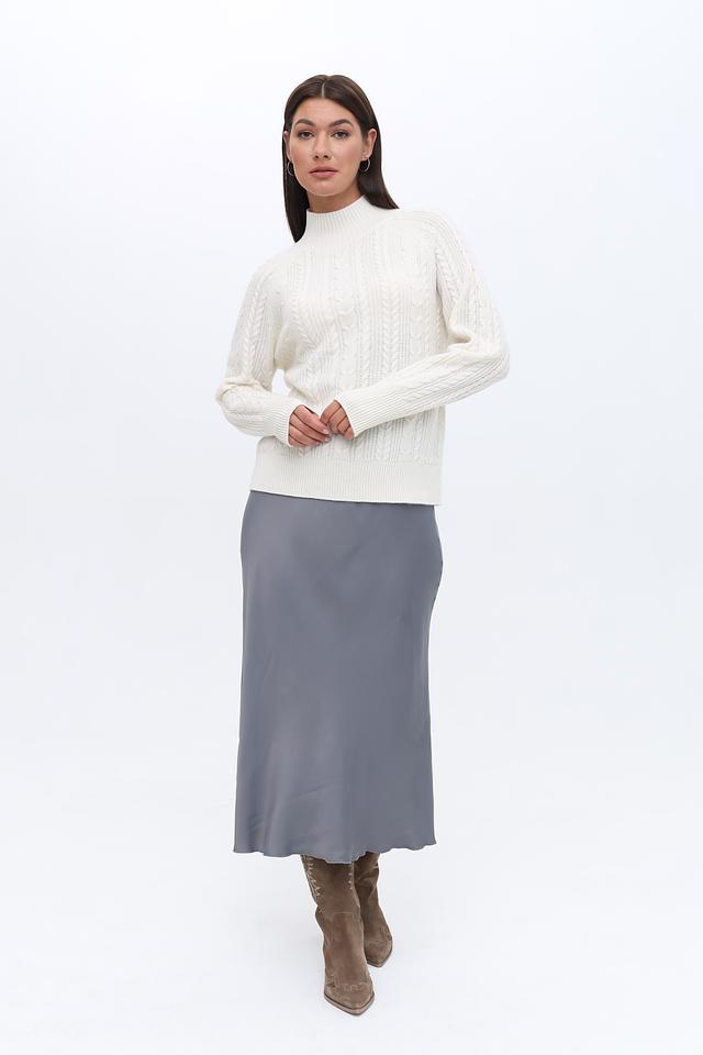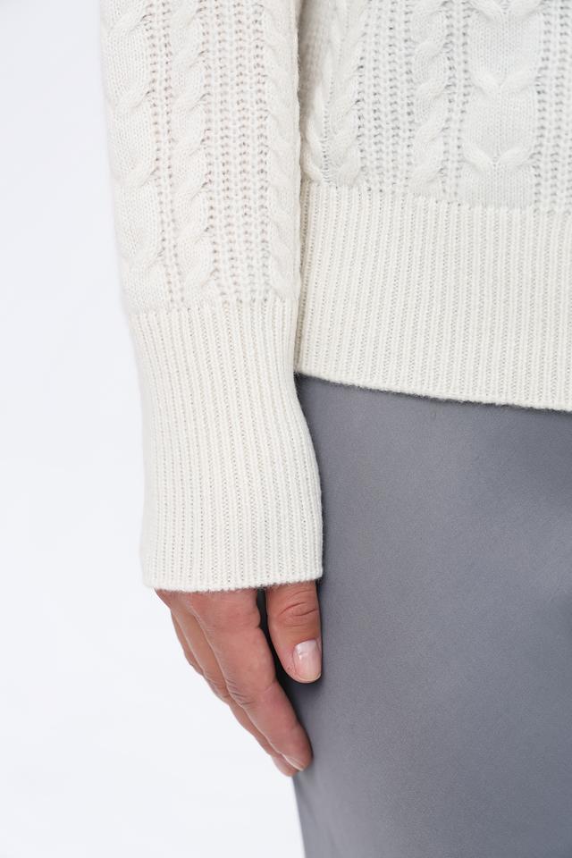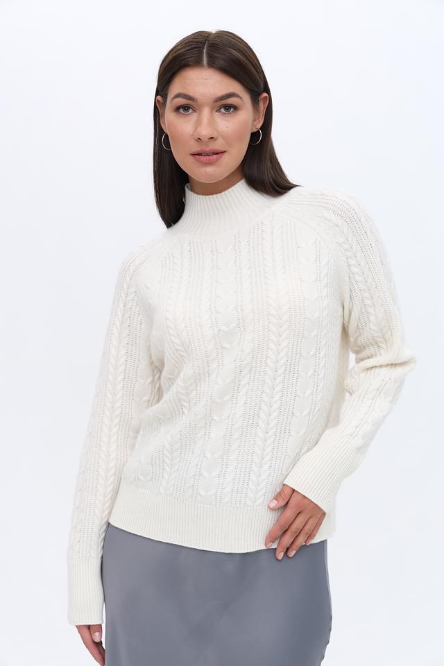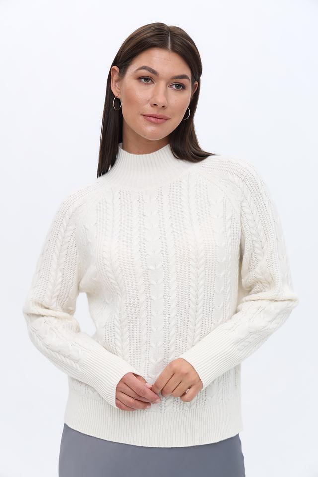 Молочный оттенок пуловера универсален и легко сочетается с различными элементами одежды. Высокий горл придаёт модели изысканность, а рельефная коса добавляет текстуру и объём.