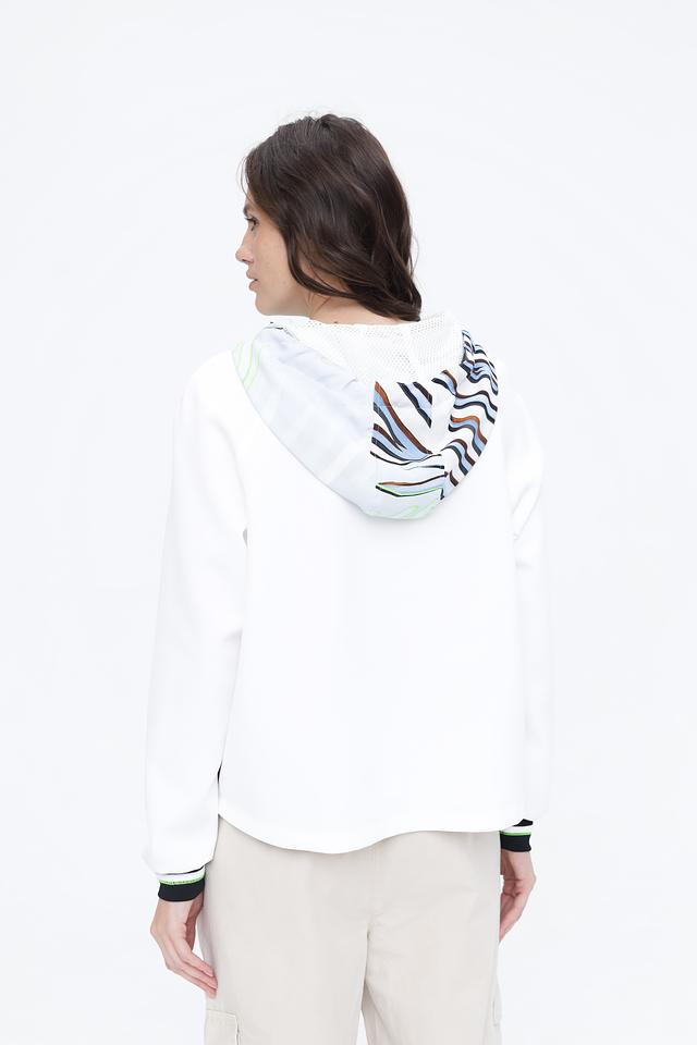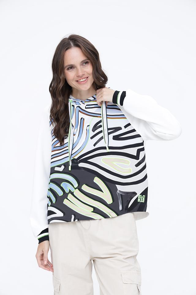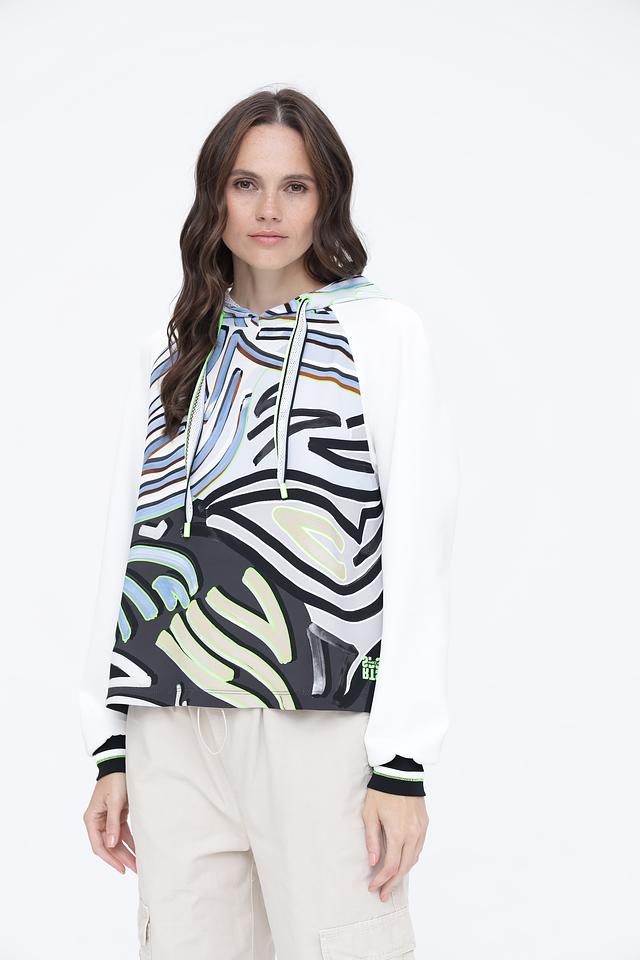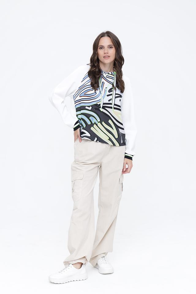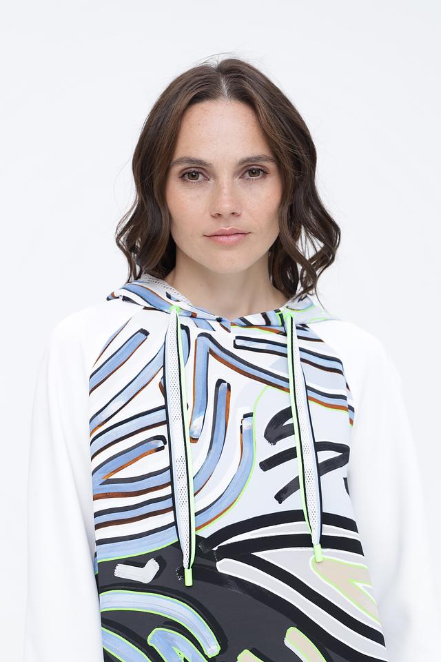 Белый пуловер Marc Cain с ярким абстрактным принтом и капюшоном станет стильным дополнением к вашему гардеробу. Модель выполнена из мягкого полиэстера с добавлением эластана для комфорта и свободы движений. Состав: полиэстер 87%, эластан 13%