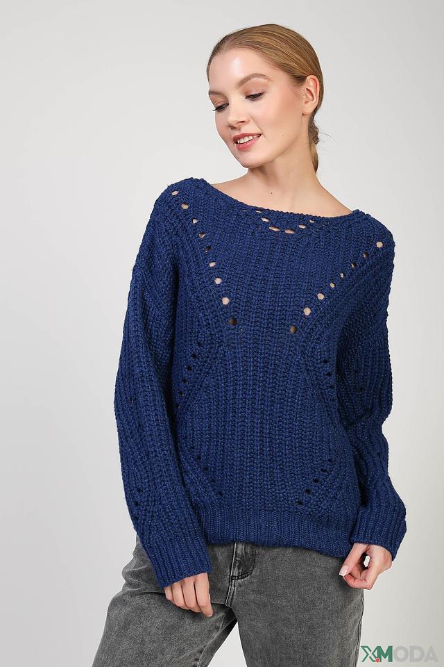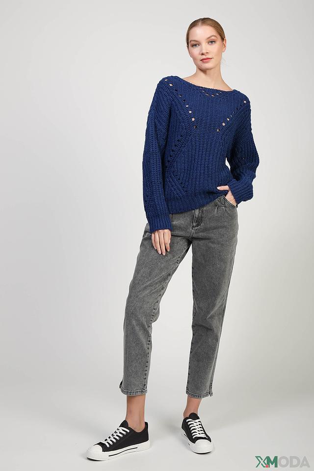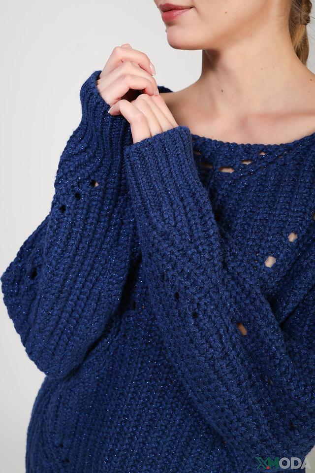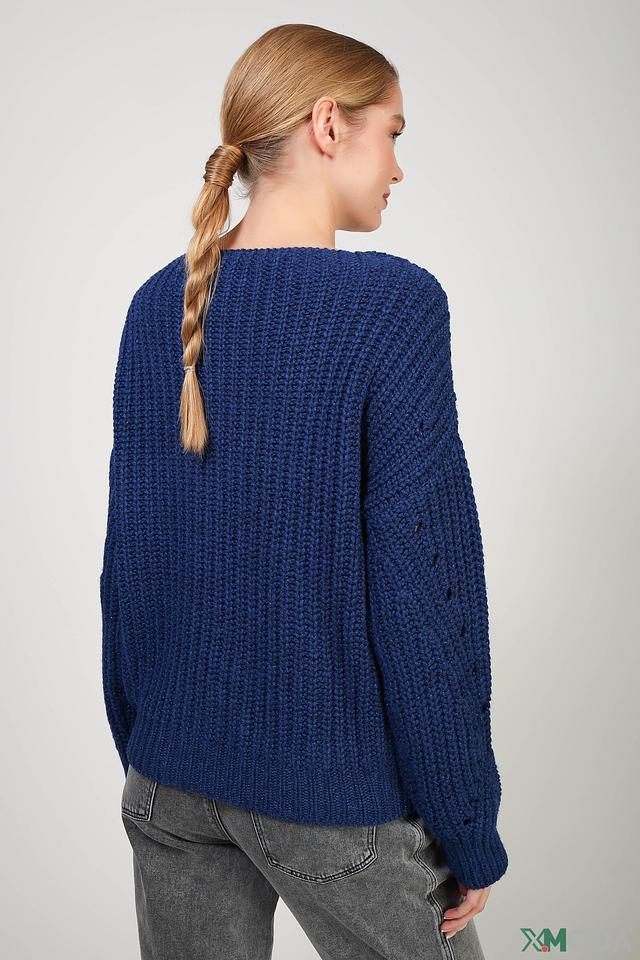 Пуловер имеет насыщенный синий цвет и выполнен с использованием рельефного вязания, которое придает ему особую текстуру. Ажурная горловина добавляет изысканности и женственности образу. Свободный крой обеспечивает свободу движений и позволяет создавать различные стилистические сочетания.