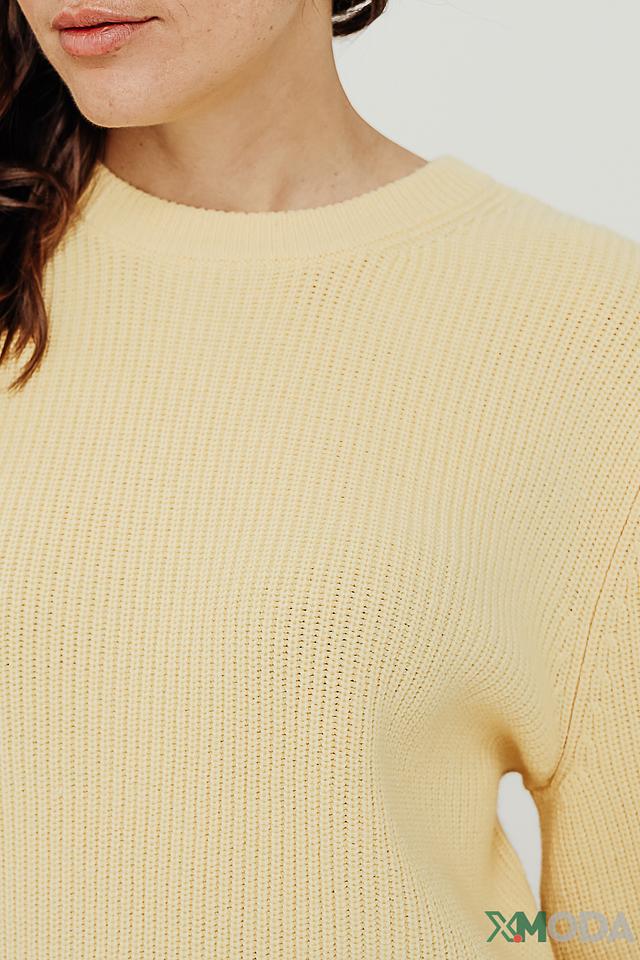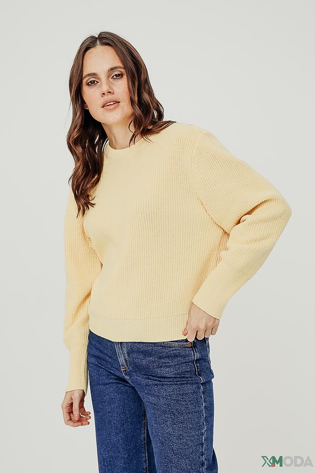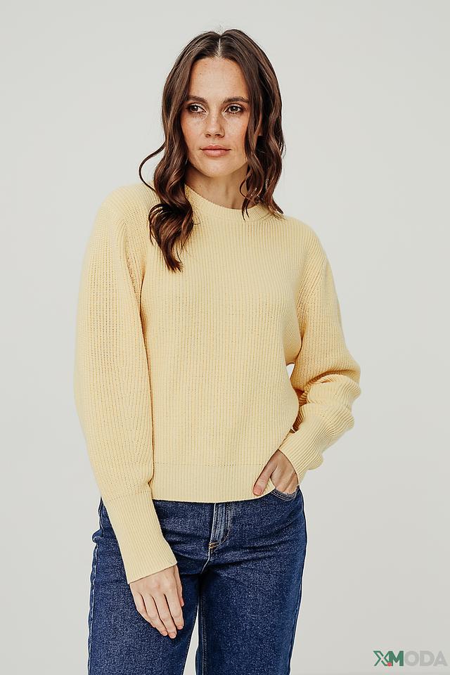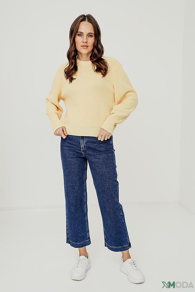 Модель имеет классический крой с округлой горловиной и рукавами-фонариками, что придает ей особый шарм. Пуловер изготовлен из высококачественной смеси шерсти (35%), полиамида (35%), вискозы (25%) и кашемира (5%).