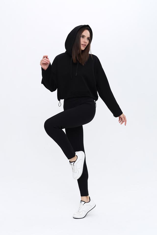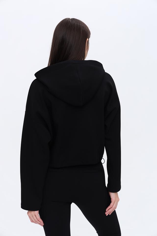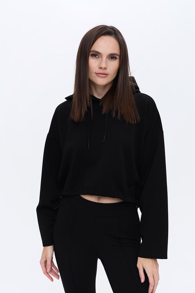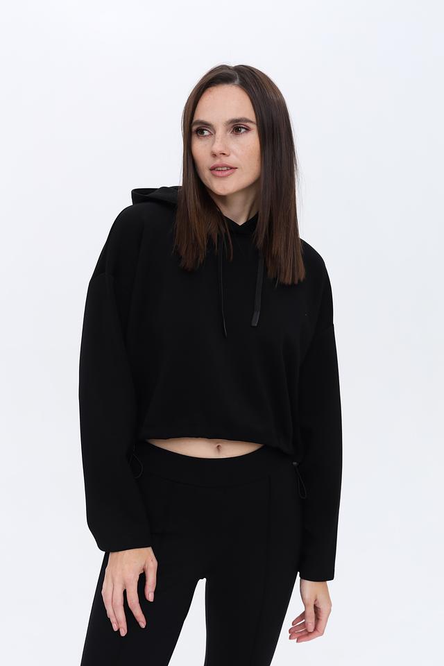 Пуловер имеет удобный капюшон со шнурками для регулировки. Укороченный крой и свободный силуэт делают его идеальным для создания модных и расслабленных образов. Рукава объёмные, слегка спущены.