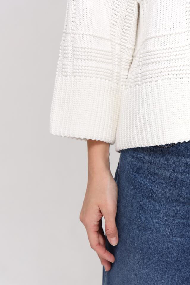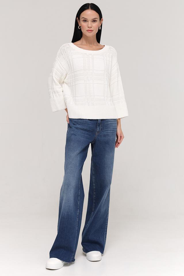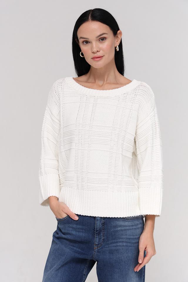 Пуловер имеет свободный крой и удобную длину, что обеспечивает комфорт при носке. Особое внимание привлекает текстурный узор в виде геометрических фигур, который добавляет изделию оригинальности и изысканности.
