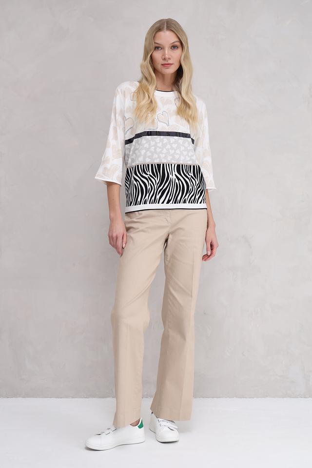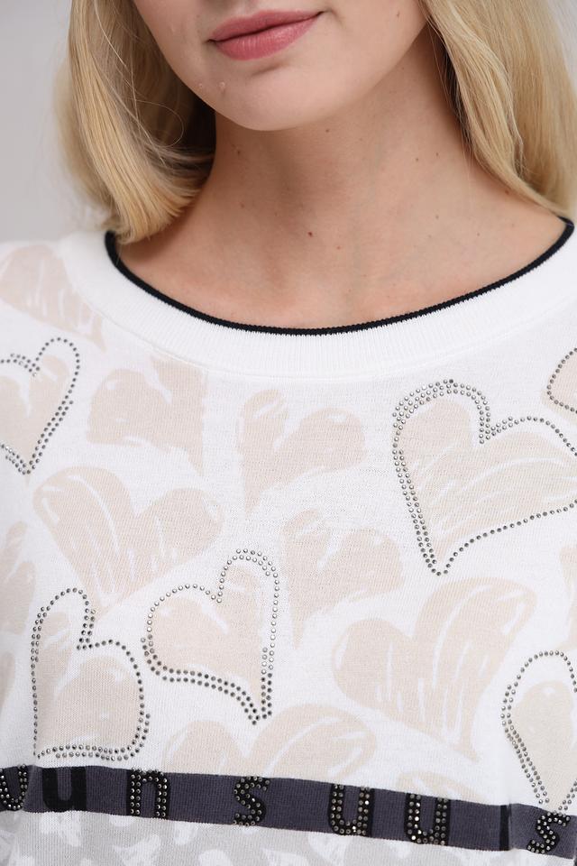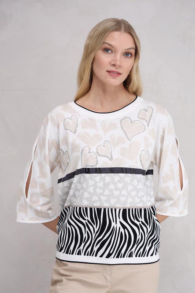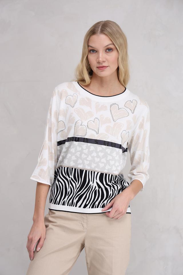 Женский пуловер Tuzzi бежевого цвета с оригинальным дизайном, сочетающим в себе принт "зебра", узор в виде сердечек и декоративную полосу с логотипом. Изготовлен из 100% хлопка, обеспечивающего комфорт и удобство в носке. Состав: хлопок 100%