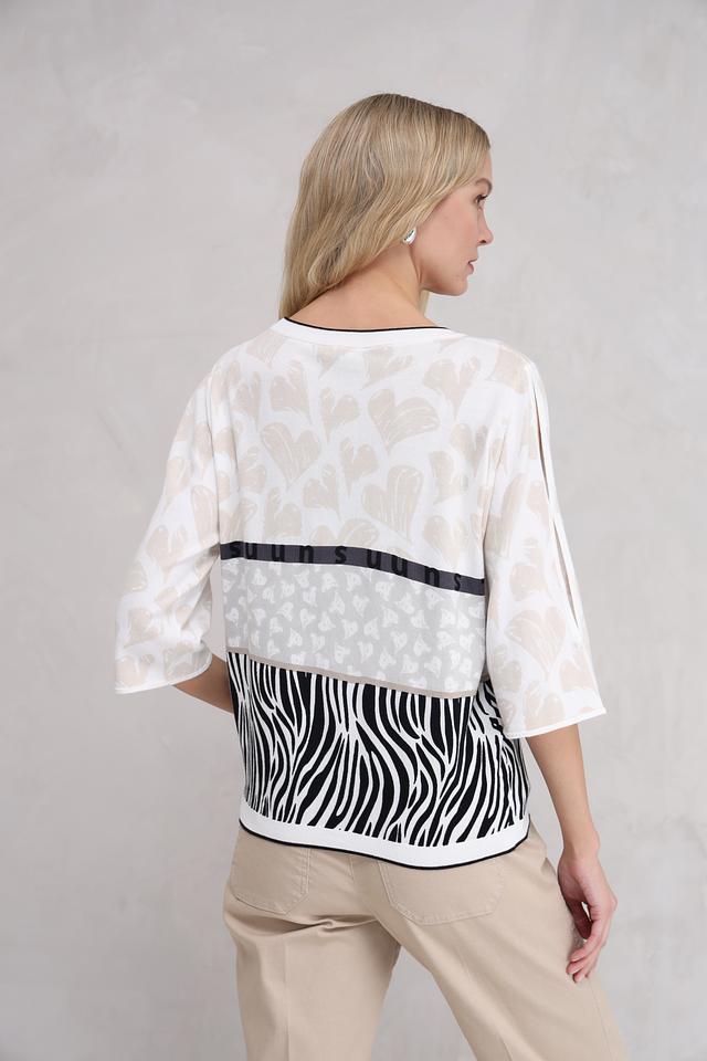 Этот стильный пуловер от Tuzzi станет ярким акцентом вашего образа. Модель выполнена в бежевых тонах и отличается необычным сочетанием принтов: в нижней части изделия расположен эффектный принт "зебра", верхняя часть украшена нежным узором из сердечек. Декоративная полоса с логотипом бренда добавляет изысканности.
