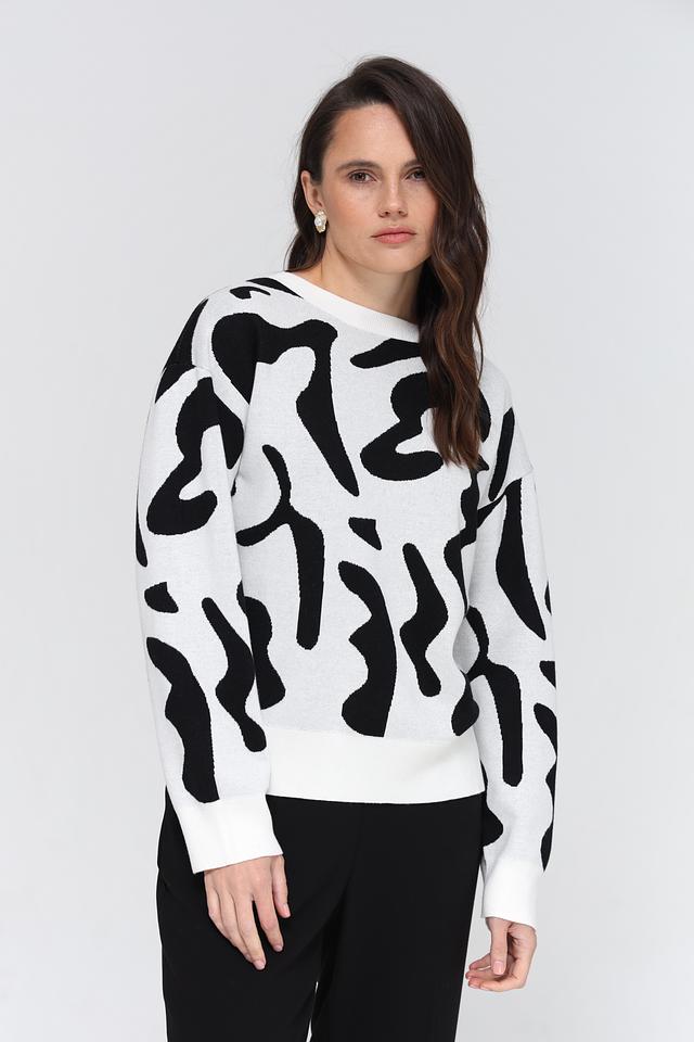 Этот пуловер от UNQ станет ярким акцентом в вашем образе. Он выполнен в белом цвете и украшен эффектным абстрактным рисунком чёрного цвета, который придает ему современный и динамичный вид.