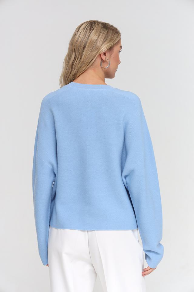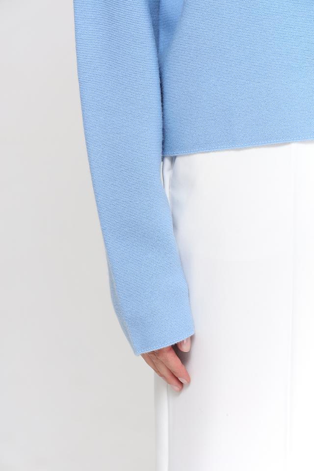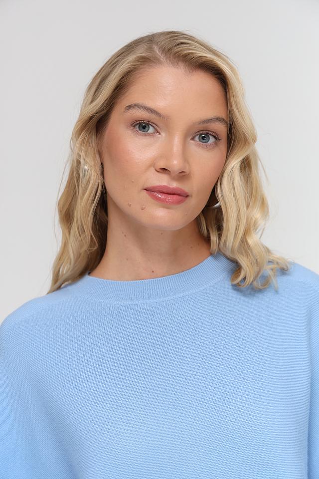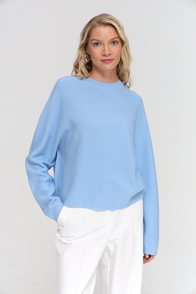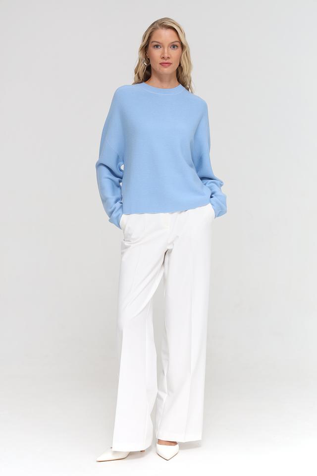 Пуловер имеет свободный, слегка заниженный крой, который обеспечивает свободу движений и комфортную посадку по фигуре. Круглый вырез горловины делает его универсальным и подходящим для различных стилей. Голубой цвет пуловера освежает образ и легко сочетается с другими цветами в вашем гардеробе.