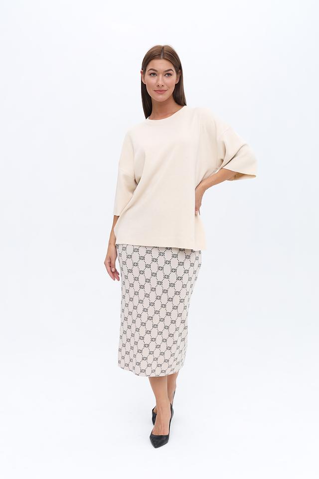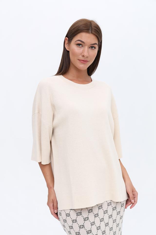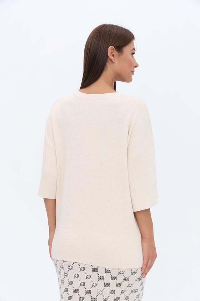 Пуловер имеет свободный крой, короткие рукава и круглый вырез горловины. Текстура ткани слегка рельефная, что придает изделию дополнительный объем и интересную фактуру.