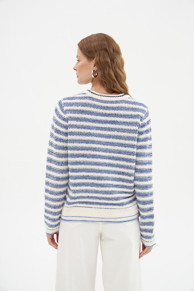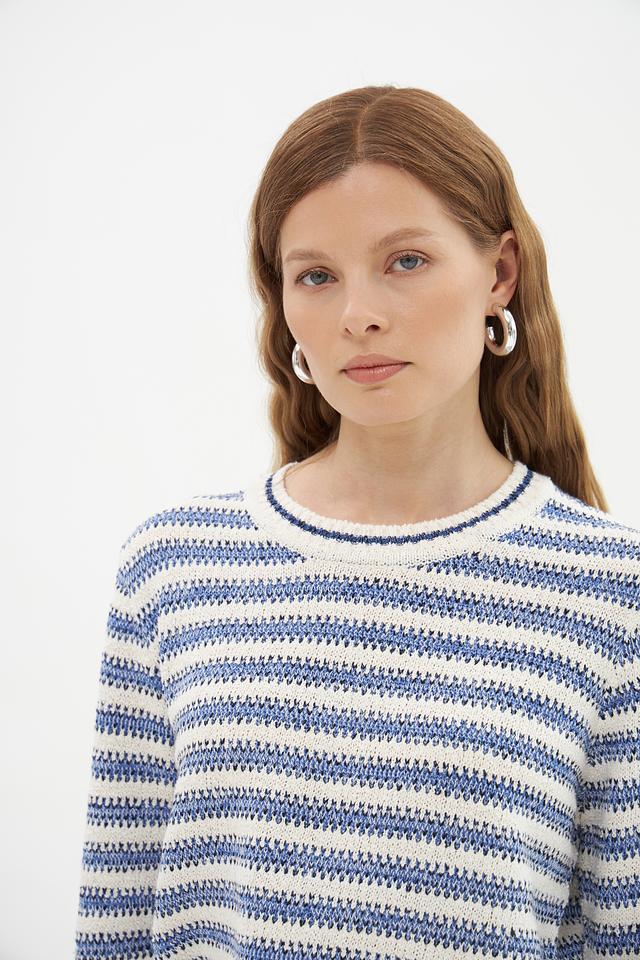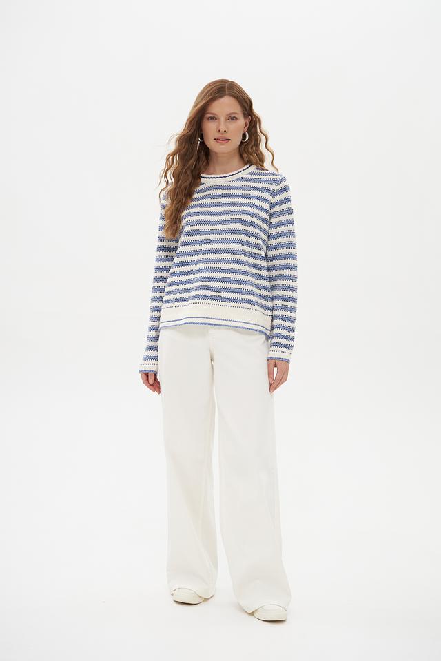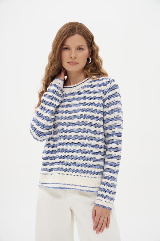 Этот стильный пуловер от Gerry Weber выполнен в классическом крое с круглым вырезом горловины и длинными рукавами. Основной цвет изделия – белый, дополненный синими полосами различной ширины, создающими яркий и динамичный образ.