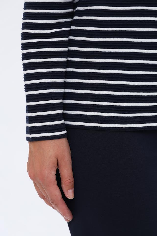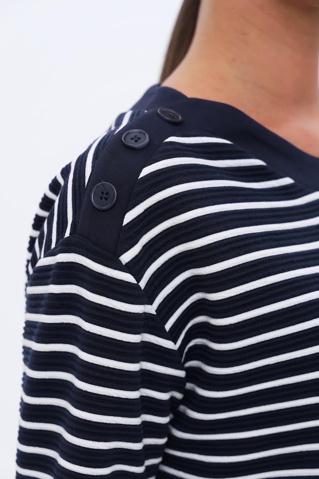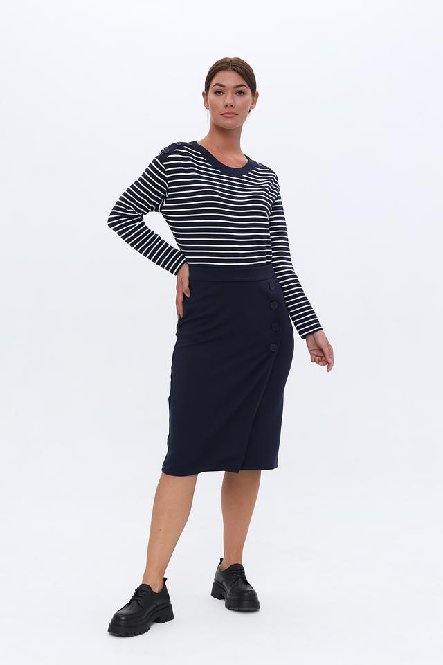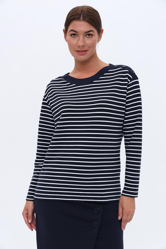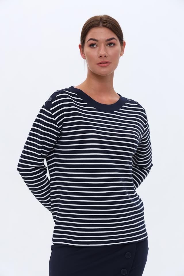 Женский пуловер Lebek синего цвета с белыми полосами – это стильная и удобная модель с круглым вырезом и декоративными пуговицами на плечах. Изготовлен из мягкого и приятного к телу материала, обеспечивающего комфорт в течение дня. Состав: полиэстер 96%, эластан 4%