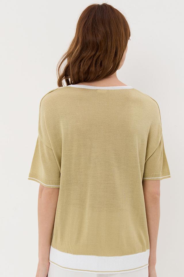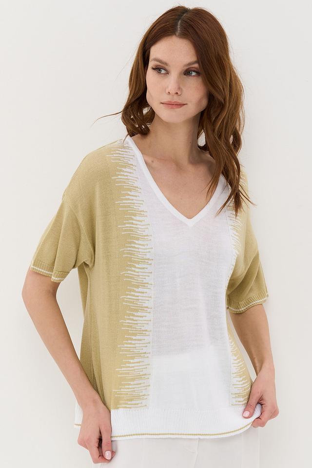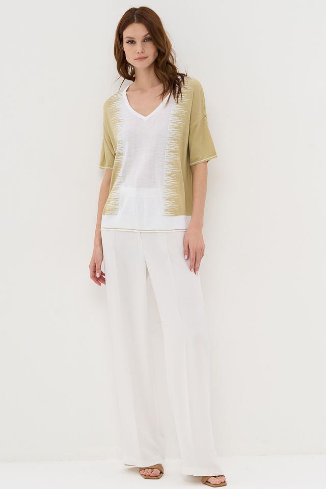Пуловер имеет оливковый цвет и свободный крой, который не сковывает движения. Короткие рукава делают его идеальным для теплой погоды. Оригинальной деталью является бахрома, расположенная по переду изделия, что придает ему особый шарм и индивидуальность.