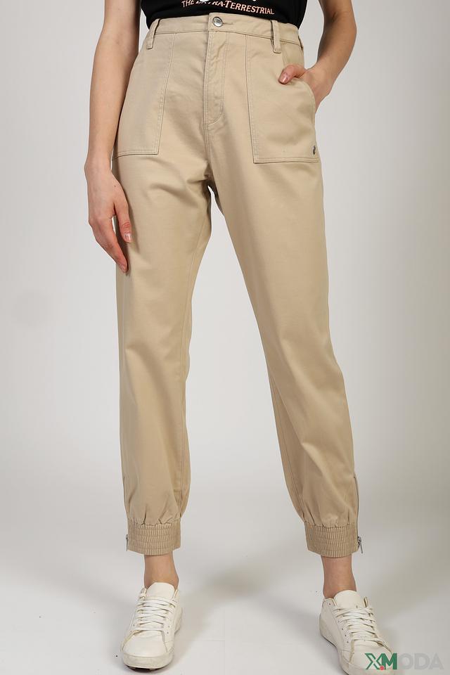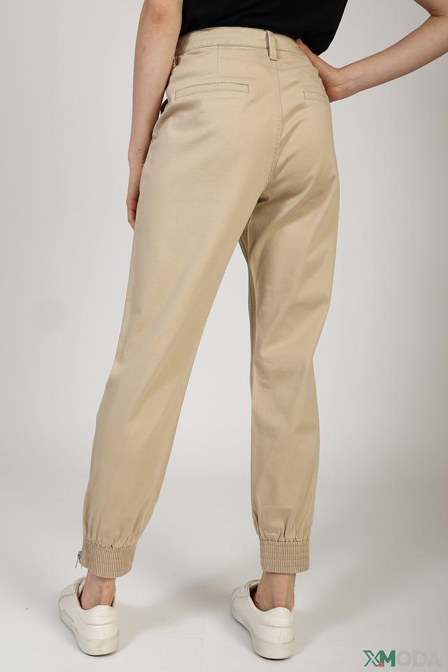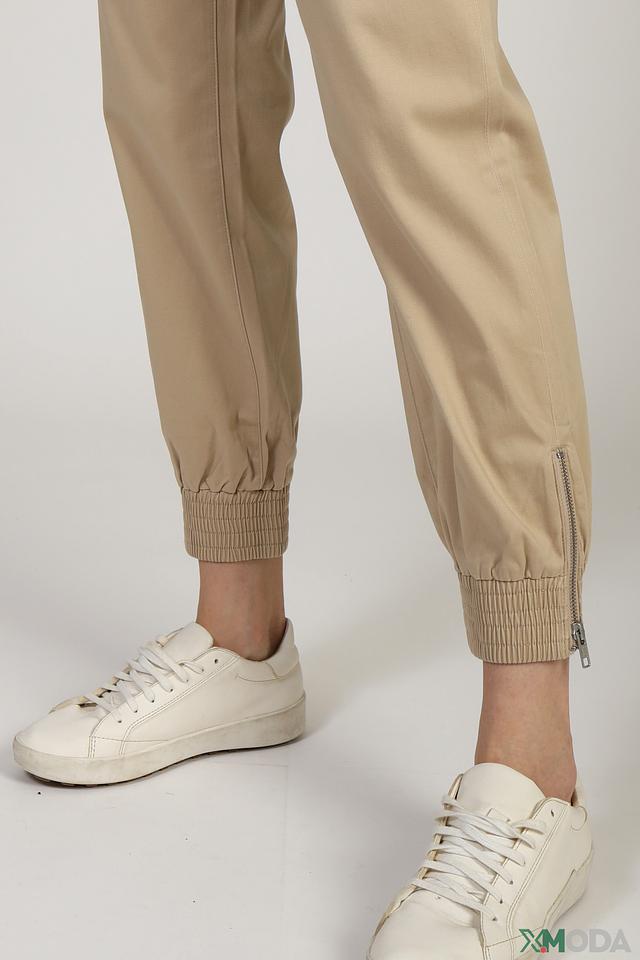 Брюки имеют высокую посадку, что визуально удлиняет ноги и подчеркивает талию. Функциональные карманы добавляют практичности. Застежка на молнию и пуговицу обеспечивает надежную фиксацию. Эластичные манжеты внизу брюк создают современный и расслабленный образ.