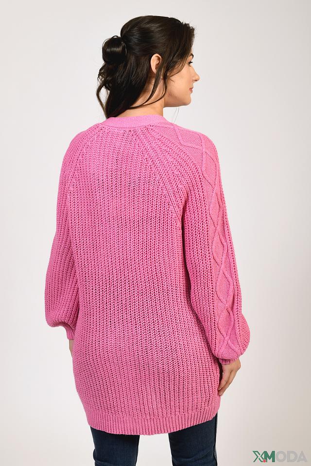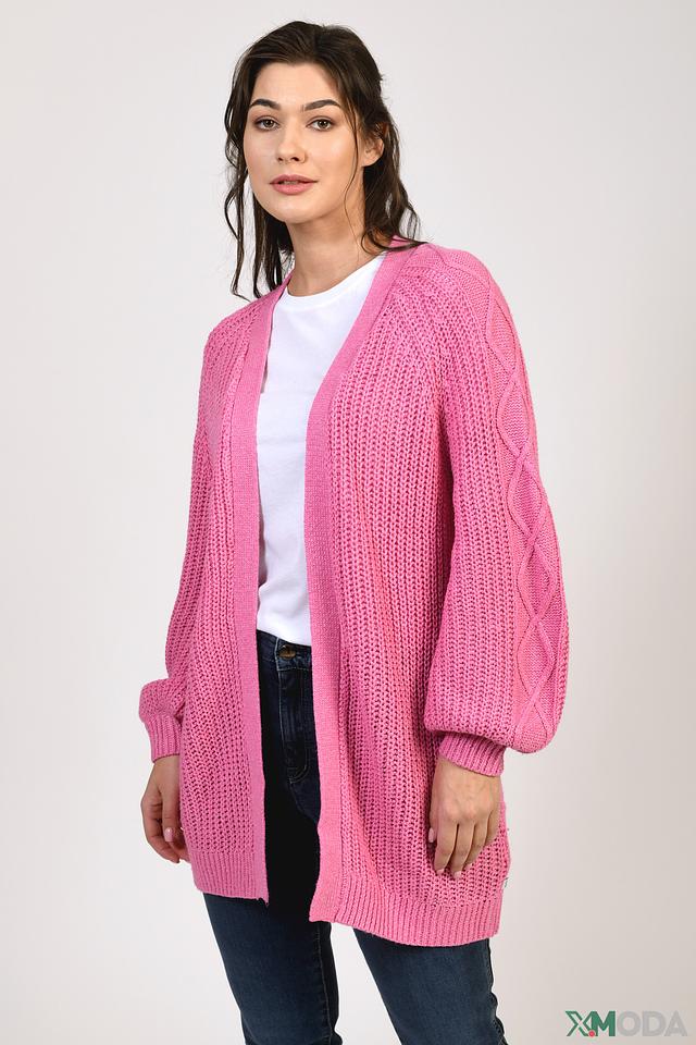 Модель отличается оригинальной вязкой с косами на рукавах, что придает ей особый шарм. Кардиган имеет длинные объёмные рукава и открытый передок, что позволяет носить его с различными вариантами одежды.