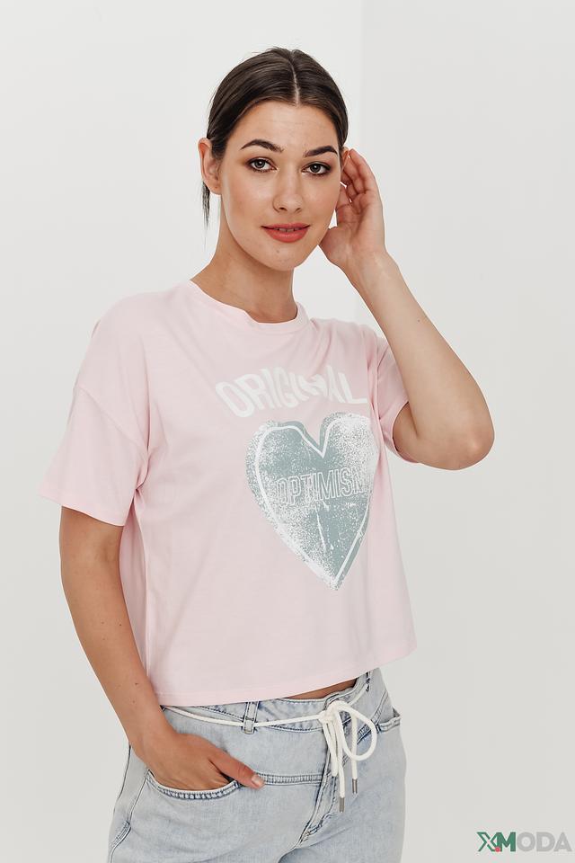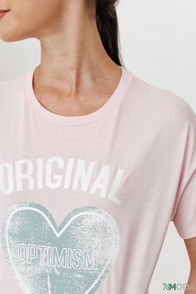 Женская футболка QS нежно-розового цвета с оригинальным принтом в виде сердца и надписью "ORIGINAL OPTIMISM". Модель выполнена из мягкого хлопка с модалом, обеспечивающего комфорт и приятные ощущения при носке. Состав: хлопок 50%, модал 50%