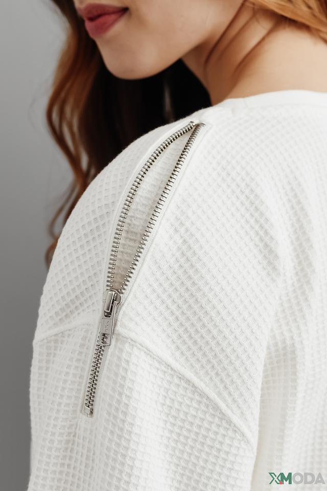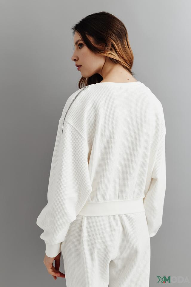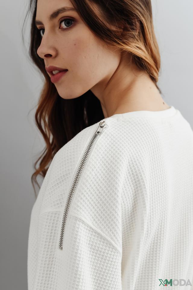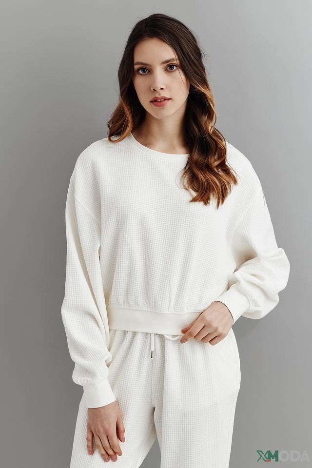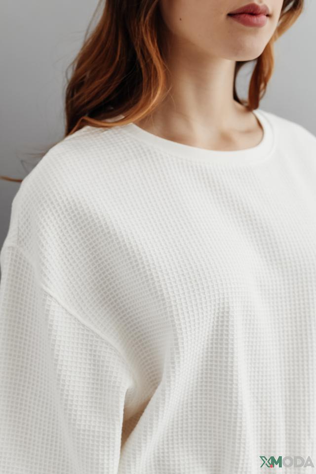 Модель имеет свободный крой, который не сковывает движения, и круглый вырез горловины. Текстура ткани "вафля" придает пуловеру оригинальность и стильный вид.