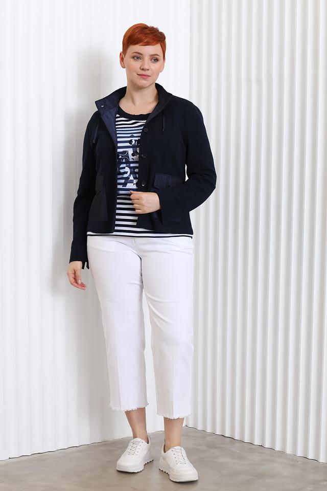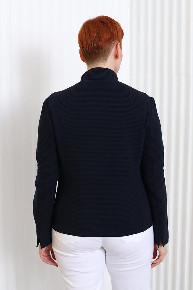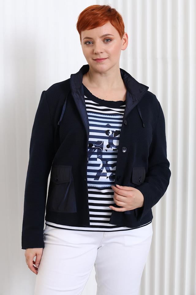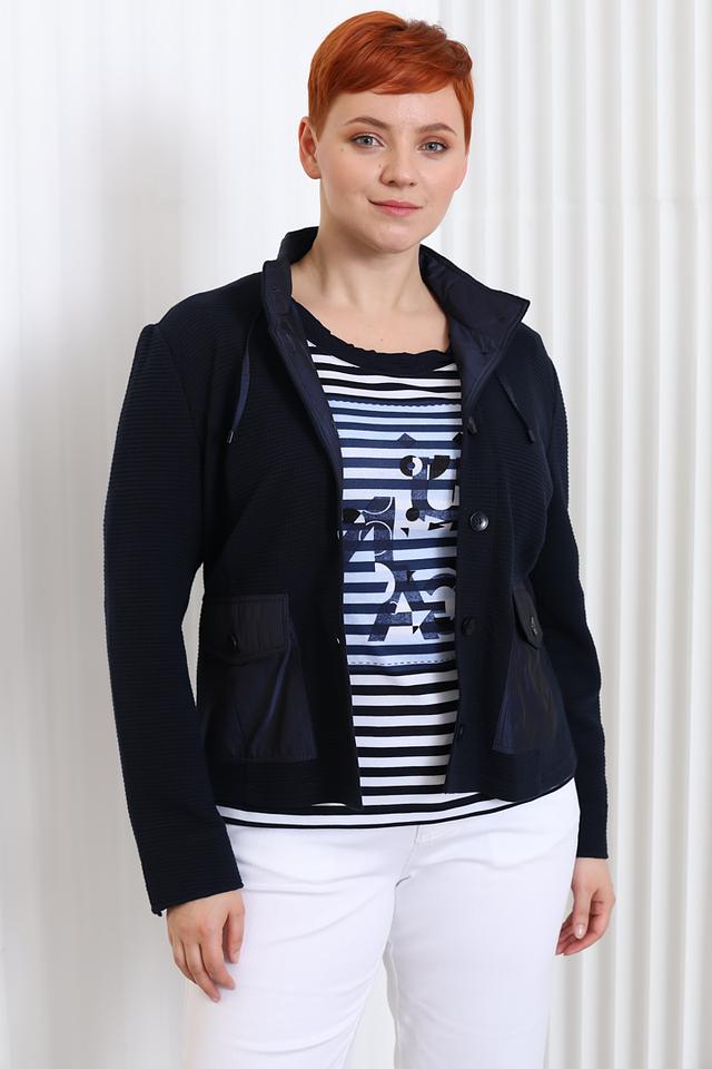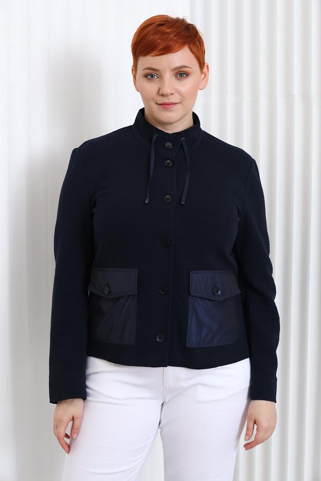 Жакет Rabe collection темно-синего цвета – стильная и удобная модель с застежкой на пуговицы и декоративными накладными карманами. Жакет выполнен из фактурного трикотажа с добавлением хлопка, полиэстера и эластана, что обеспечивает комфорт и хорошую посадку по фигуре. Состав: хлопок 87%, полиэстер 11%, эластан 2%