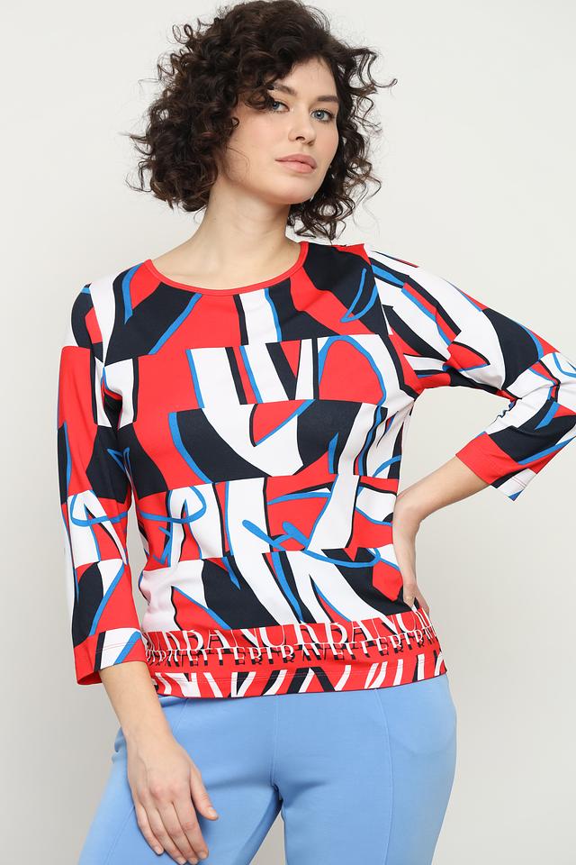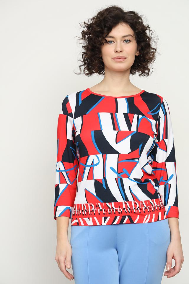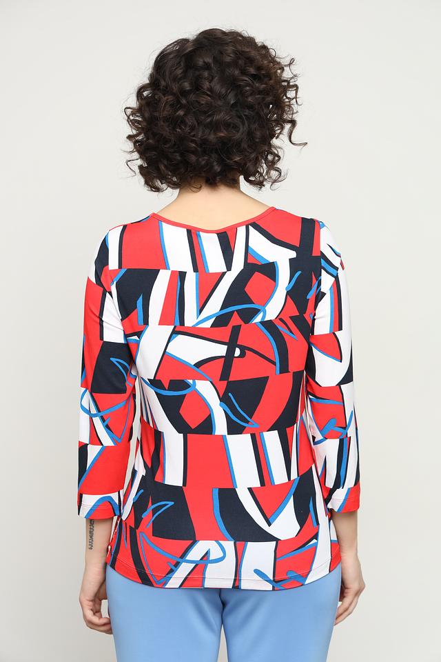 Блуза от Rabe collection яркого красного цвета с оригинальным абстрактным принтом и рукавом 3/4. Изготовлена из мягкой и приятной к телу вискозы с добавлением эластана для комфортной посадки. Состав: вискоза 92%, эластан 8%
