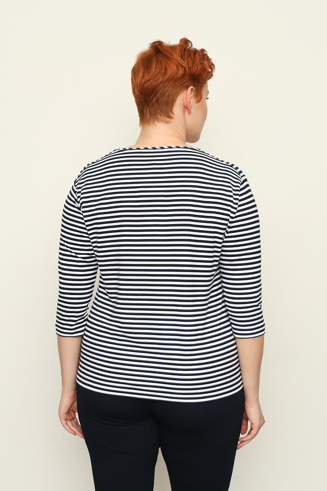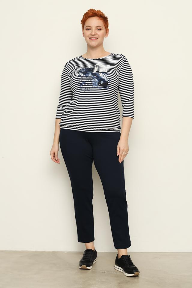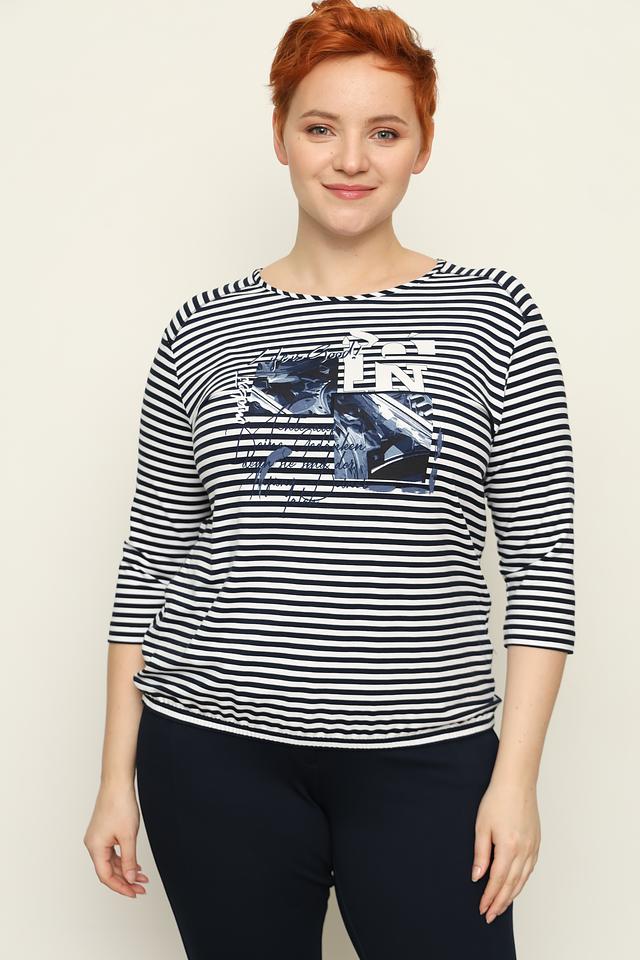 Лонгслив имеет классический крой и длинные рукава. Чёрно-белая полоска в сочетании с ярким принтом делает его интересным и привлекательным. Модель отлично сочетается с джинсами, брюками или юбками.