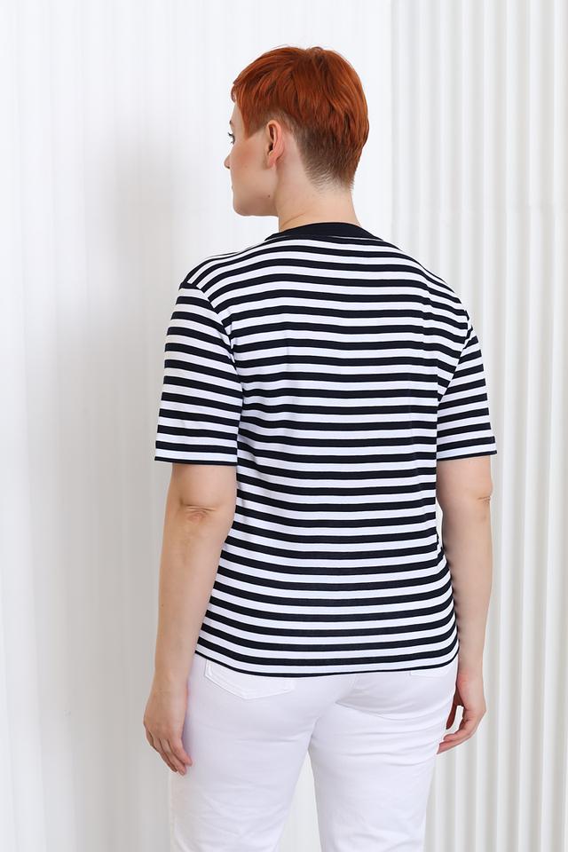 Женская футболка Rabe collection сине-белого цвета с ярким принтом. Модель выполнена из 100% хлопка, обеспечивая комфорт и удобство в носке. Стильный дизайн с полоской и оригинальным рисунком. Состав: хлопок 100%
