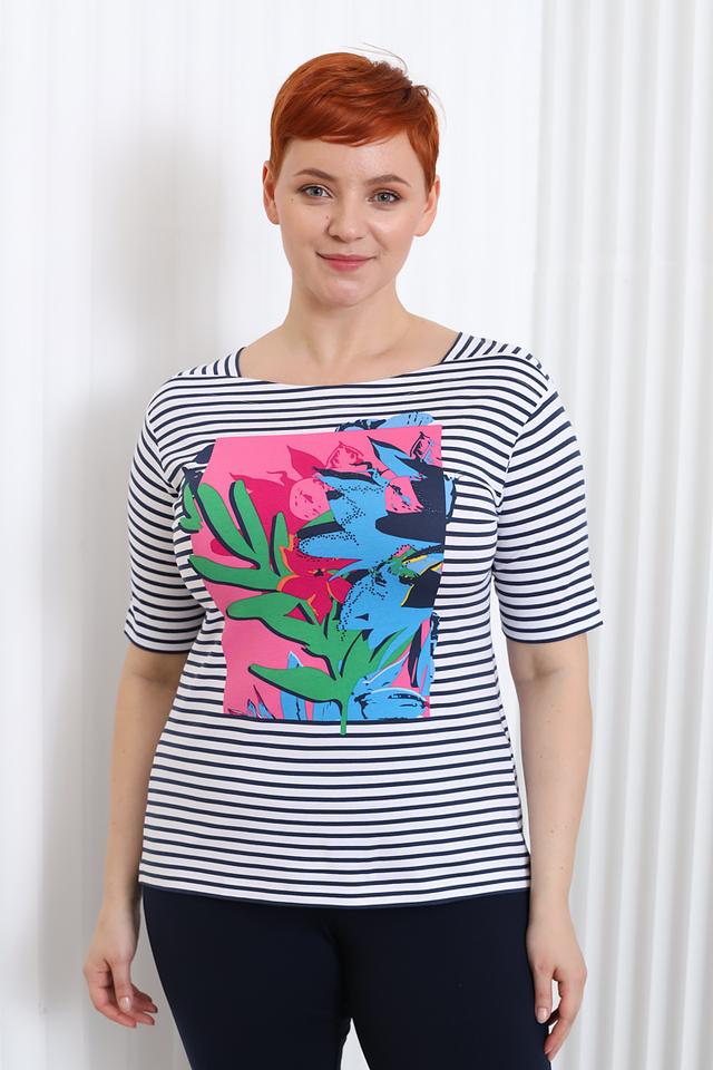 Женская футболка Rabe collection белого и синего цвета с ярким цветочным принтом. Модель выполнена из мягкой вискозы с добавлением эластана, обеспечивающего комфортную посадку. Состав: вискоза 92%, эластан 8%