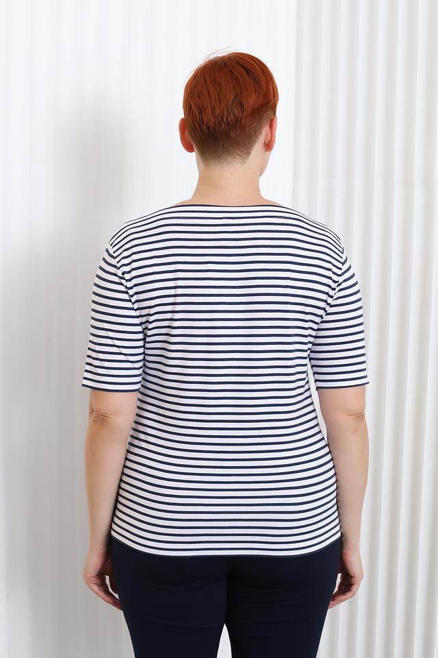 Эта стильная футболка от Rabe collection станет отличным дополнением к вашему гардеробу. Она выполнена в классическом сочетании белого и синего цвета в горизонтальную полоску.