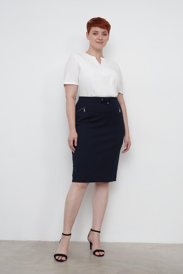 Юбка имеет прямой крой, который подчеркивает фигуру, не сковывая движений. Наличие функциональных карманов и декоративных молний добавляет практичности и стиля. Эластичный пояс с кулиской обеспечивает комфортную посадку по талии.