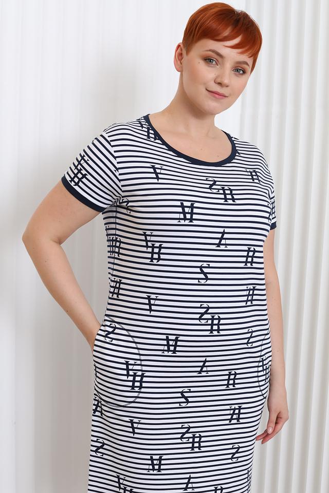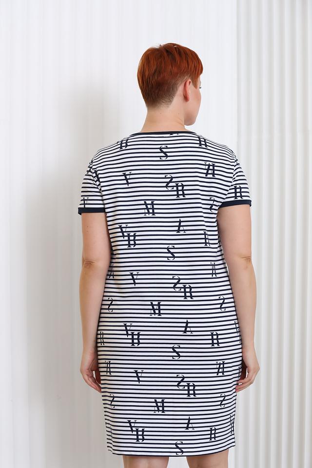 Платье имеет прямой силуэт, короткий рукав и круглый вырез горловины. Оно украшено классической бело-синей полоской и оригинальным принтом с буквами, которые добавляют образу индивидуальности. Отделка горловины и рукавов выполнена из темной ткани, что подчеркивает линии кроя.